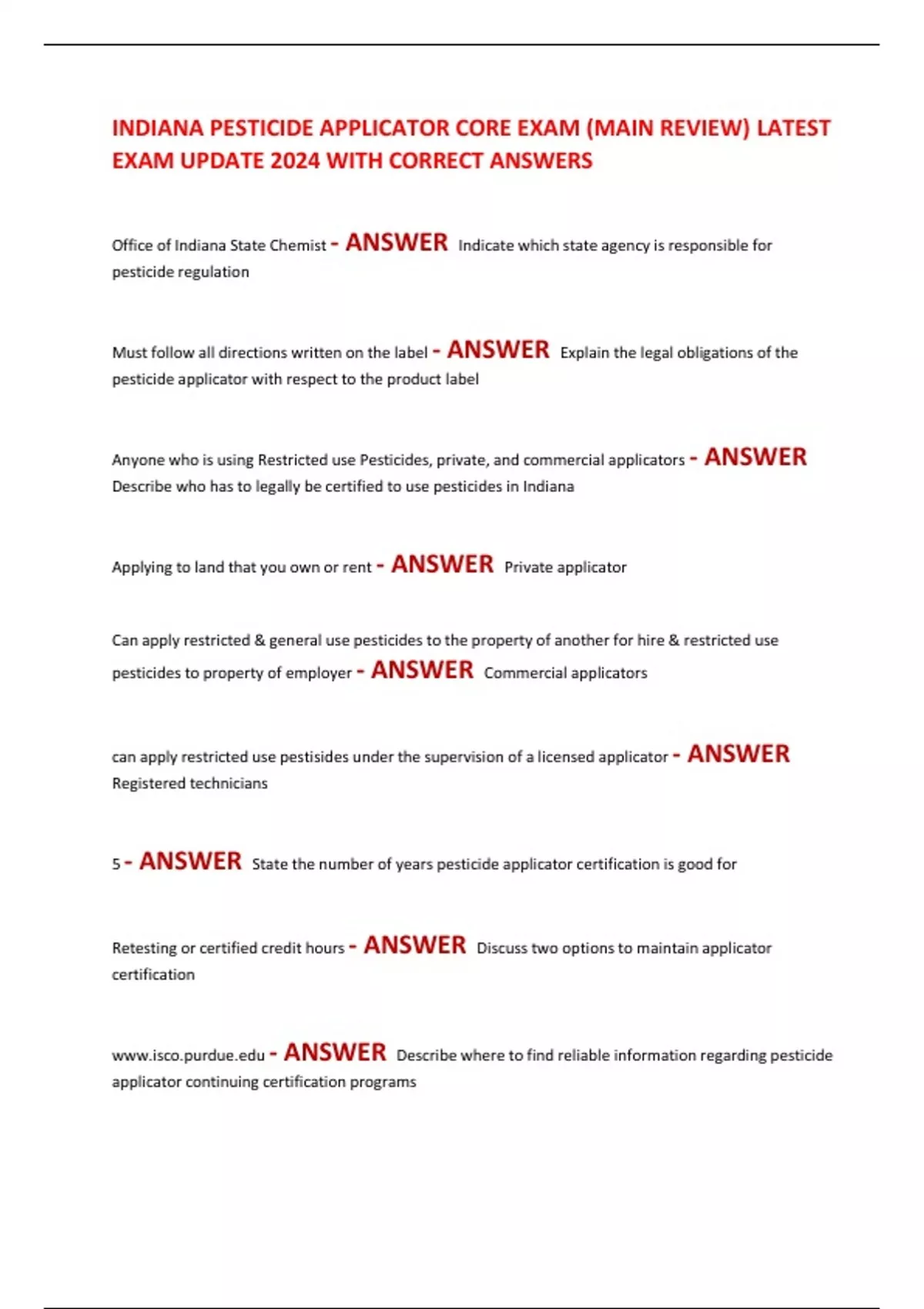 INDIANA PESTICIDE APPLICATOR CORE EXAM (MAIN REVIEW) LATEST EXAM UPDATE 2024 WITH CORRECT ANSWERS