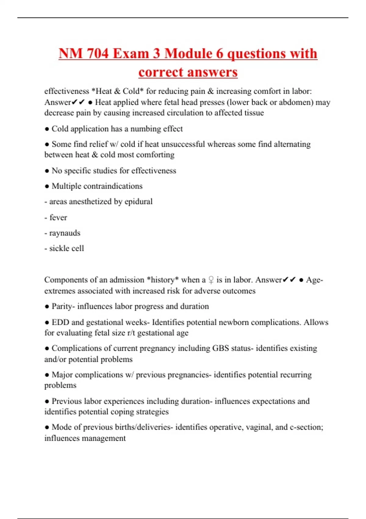 NM 704 Exam 3 Module 6 questions with correct answers effectiveness *Heat & Cold* for reducing pain & increasing comfort in labor: Answer ● Heat applied where fetal head presses (lower back or abdomen) may decrease pain by causing increased circulation to affected tissue ● Cold application has a numbing effect ● Some find relief w/ cold if heat unsuccessful whereas some find alternating between heat & cold most comforting ● No specific studies for effectiveness ● Multiple contraindications - areas anesthetized by epidural - fever - raynauds - sickle cell Components of an admission *history* when a ♀ is in labor. Answer ● Age- extremes associated with increased risk for adverse outcomes ● Parity- influences labor progress and duration ● EDD and gestational weeks- Identifies potential newborn complications. Allows for evaluating fetal size r/t gestational age ● Complications of current pregnancy including GBS status- identifies existing and/or potential problems ● Major complications w/ previous pregnancies- identifies potential recurring problems ● Previous labor experiences including duration- influences expectations and identifies potential coping strategies ● Mode of previous births/deliveries- identifies operative, vaginal, and c-section; influences management ● Size of previous babies- estimate of pelvic adequacy ● Fetal movement pattern- fetal well-being ● Vaginal bleeding- differentiated from bloody show; vaginal bleeding is abnormal, contraindicative of digital cervical exam and indicates need for collaboration ● Status of membranes- duration of ROM and characteristics of amniotic fluid (meconium) ● Time of onset of contractions and characteristics (frequency, duration, intensity, aggravating/relieving factors)-helps discriminate true from false labor as well as establishes onset of labor ● Last oral intake- baseline energy and fluid status; useful for anesthesia in case of need for surgery Components of an admission *physical* when a ♀ is in labor. Answer ● VS (BP, Temp, HR, RR) ● Auscultation of heart and lungs ● Abdominal palpation ○ Determine contraction pattern ○ Assess fetal lie, presentation, position, and engagement ○ Estimated fetal weight and fundal height ● Visual inspection for abdominal scars ● Assessment for presence of peripheral edema ● Cervical Examination ○ Cervical effacement and dilation ○ Position of cervix ○ Station of fetal presenting part ○ Presence of molding or caput succedaneum ○ Fetal lie, presentation, position ○ Tone and elasticity of vagina and perineum ○ Confirmation of membrane status ○ Visual inspection of perineum ○ Assessment of FHR recommended frequency for the assessment of maternal vital signs in the first stage of labor. (w/o epidural) Answer BP, HR, RR: q 1 hour Temp: q2-4 hr when temp normal and membranes intact; recommended frequency for the assessment of maternal temp Answer q 1-2 hr if temp abnormal &/or after ROM recommendations for frequency of continuous FHR assessment during 1st stage of labor. Answer ● q30min (no complications) ○ Q15min if complications recommendations for frequency of continuous FHR assessment during 2nd stage of labor. Answer ● q15min (no complications) ○ Q5min if complications recommendations for frequency of Intermittent Auscultation FHR assessment during 1st stage of labor. Answer ● q15-30min