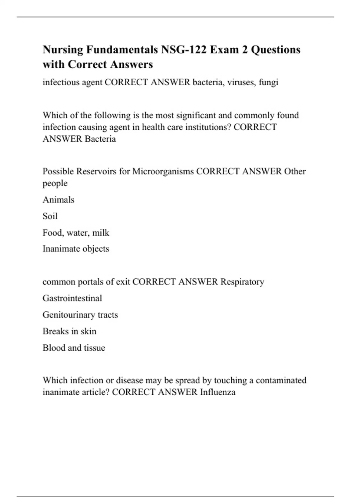 Nursing Fundamentals NSG-122 Exam 2 Questions with Correct Answers