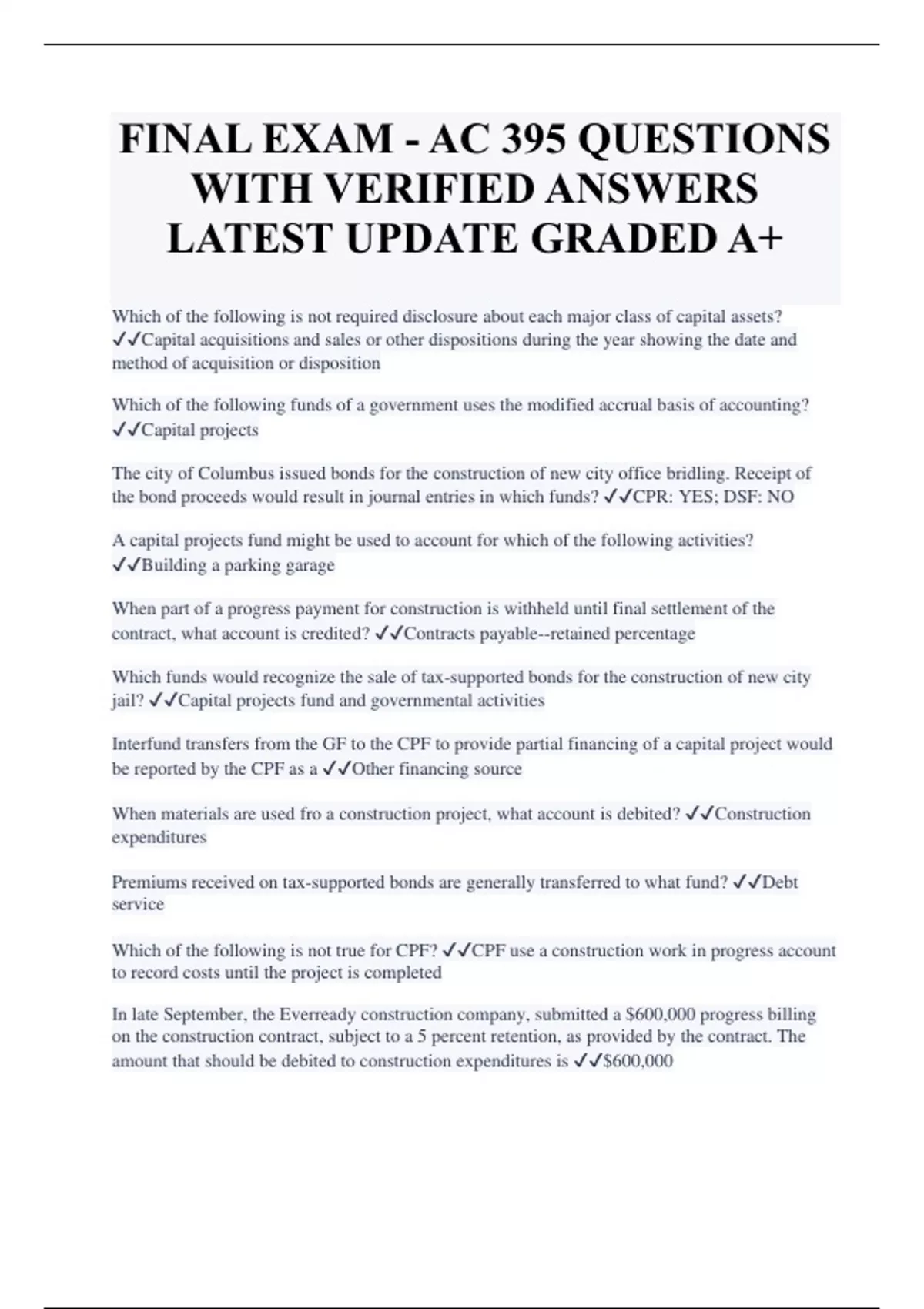 FINAL EXAM - AC 395 QUESTIONS WITH VERIFIED ANSWERS LATEST UPDATE GRADED A+ Which of the following is not required disclosure about each major class of capital assets? Capital acquisitions and sales or other dispositions during the year showing the date and method of acquisition or disposition Which of the following funds of a government uses the modified accrual basis of accounting? Capital projects The city of Columbus issued bonds for the construction of new city office bridling. Receipt of the bond proceeds would result in journal entries in which funds? CPR: YES; DSF: NO A capital projects fund might be used to account for which of the following activities? Building a parking garage When part of a progress payment for construction is withheld until final settlement of the contract, what account is credited? Contracts payable--retained percentage Which funds would recognize the sale of tax-supported bonds for the construction of new city jail? Capital projects fund and governmental activities Interfund transfers from the GF to the CPF to provide partial financing of a capital project would be reported by the CPF as a Other financing source When materials are used fro a construction project, what account is debited? Construction expenditures Premiums received on tax-supported bonds are generally transferred to what fund? Debt service Which of the following is not true for CPF? CPF use a construction work in progress account to record costs until the project is completed