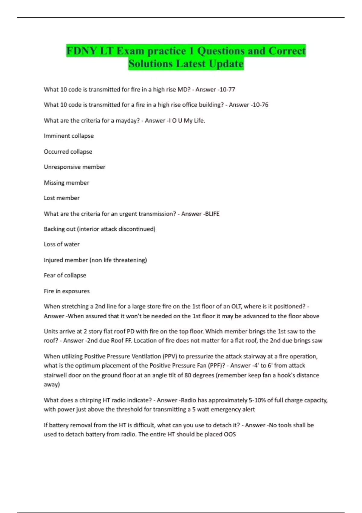 FDNY LT Exam practice 1 Questions and Correct Solutions Latest Update What 10 code is transmitted for fire in a high rise MD? - Answer -10-77 What 10 code is transmitted for a fire in a high rise office building? - Answer -10-76 What are the criteria for a mayday? - Answer -I O U My Life. Imminent collapse Occurred collapse Unresponsive member Missing member Lost member What are the criteria for an urgent transmission? - Answer -BLIFE Backing out (interior attack discontinued) Loss of water
