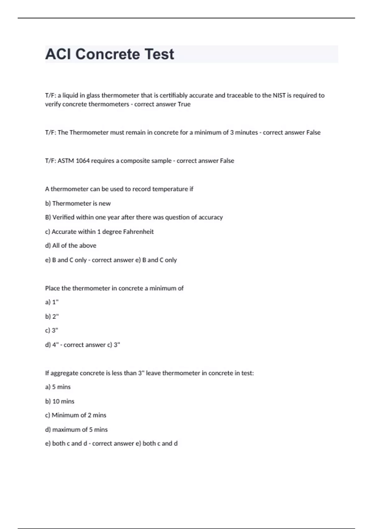 ACI Concrete TestT/F: a liquid in glass thermometer that is certifiably accurate and traceable to the NIST is required to verify concrete thermometers - correct answer True T/F: The Thermometer must remain in concrete for a minimum of 3 minutes - correct answer False T/F: ASTM 1064 requires a composite sample - correct answer False A thermometer can be used to record temperature if b) Thermometer is new B) Verified within one year after there was question of accuracy c) Accurate within 1 degree Fahrenheit d) All of the above e) B and C only - correct answer e) B and C only Place the thermometer in concrete a minimum of a) 1" b) 2" c) 3" d) 4" - correct answer c) 3" If aggregate concrete is less than 3" leave thermometer in concrete in test: a) 5 mins b) 10 mins c) Minimum of 2 mins d) maximum of 5 mins e) both c and d - correct answer e) both c and d