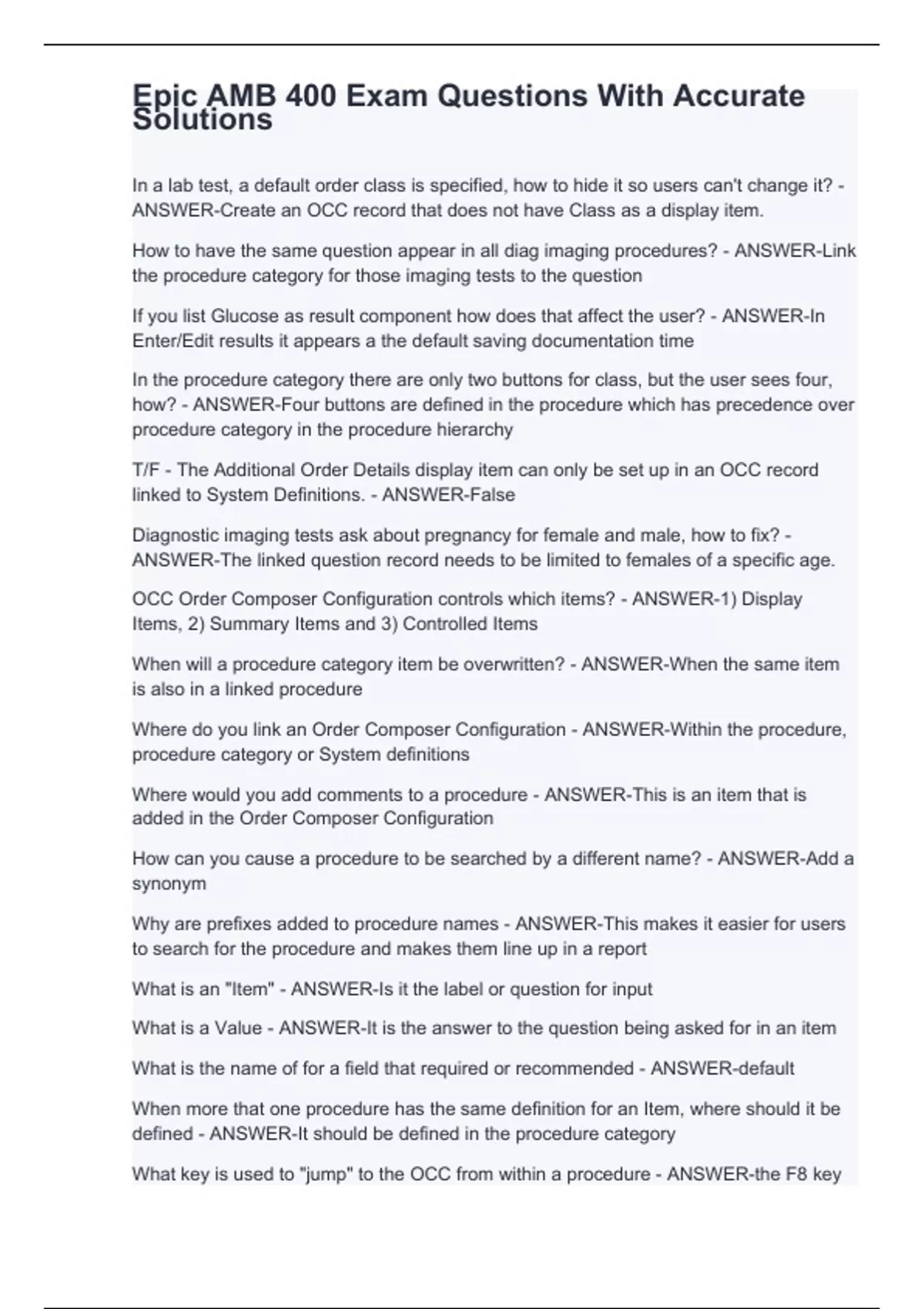 In a lab test, a default order class is specified, how to hide it so users can't change it? - ANSWER-Create an OCC record that does not have Class as a display item. How to have the same question appear in all diag imaging procedures? - ANSWER-Link the procedure category for those imaging tests to the question If you list Glucose as result component how does that affect the user? - ANSWER-In Enter/Edit results it appears a the default saving documentation time In the procedure category there are only two buttons for class, but the user sees four, how? - ANSWER-Four buttons are defined in the procedure which has precedence over procedure category in the procedure hierarchy T/F - The Additional Order Details display item can only be set up in an OCC record linked to System Definitions. - ANSWER-False Diagnostic imaging tests ask about pregnancy for female and male, how to fix? - ANSWER-The linked question record needs to be limited to females of a specific age. OCC Order Composer Configuration controls which items? - ANSWER-1) Display Items, 2) Summary Items and 3) Controlled Items When will a procedure category item be overwritten? - ANSWER-When the same item is also in a linked procedure Where do you link an Order Composer Configuration - ANSWER-Within the procedure, procedure category or System definitions Where would you add comments to a procedure - ANSWER-This is an item that is added in the Order Composer Configuration How can you cause a procedure to be searched by a different name? - ANSWER-Add a synonym Why are prefixes added to procedure names - ANSWER-This makes it easier for users to search for the procedure and makes them line up in a report What is an "Item" - ANSWER-Is it the label or question for input What is a Value - ANSWER-It is the answer to the question being asked for in an item What is the name of for a field that required or recommended - ANSWER-default When more that one procedure has the same definition for an Item, where should it be defined - ANSWER-It should be defined in the procedure category