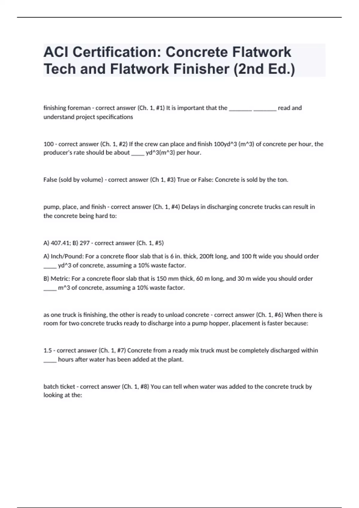 ACI Certification: Concrete Flatwork Tech and Flatwork Finisher (2nd Ed.) finishing foreman - correct answer (Ch. 1, #1) It is important that the _______ _______ read and understand project specifications 100 - correct answer (Ch. 1, #2) If the crew can place and finish 100yd^3 (m^3) of concrete per hour, the producer's rate should be about ____ yd^3(m^3) per hour. False (sold by volume) - correct answer (Ch 1, #3) True or False: Concrete is sold by the ton. pump, place, and finish - correct answer (Ch. 1, #4) Delays in discharging concrete trucks can result in the concrete being hard to: A) 407.41; B) 297 - correct answer (Ch. 1, #5) A) Inch/Pound: For a concrete floor slab that is 6 in. thick, 200ft long, and 100 ft wide you should order ____ yd^3 of concrete, assuming a 10% waste factor. B) Metric: For a concrete floor slab that is 150 mm thick, 60 m long, and 30 m wide you should order ____ m^3 of concrete, assuming a 10% waste factor. as one truck is finishing, the other is ready to unload concrete - correct answer (Ch. 1, #6) When there is room for two concrete trucks ready to discharge into a pump hopper, placement is faster because: 1.5 - correct answer (Ch. 1, #7) Concrete from a ready mix truck must be completely discharged within ____ hours after water has been added at the plant. batch ticket - correct answer (Ch. 1, #8) You can tell when water was added to the concrete truck by looking at the: