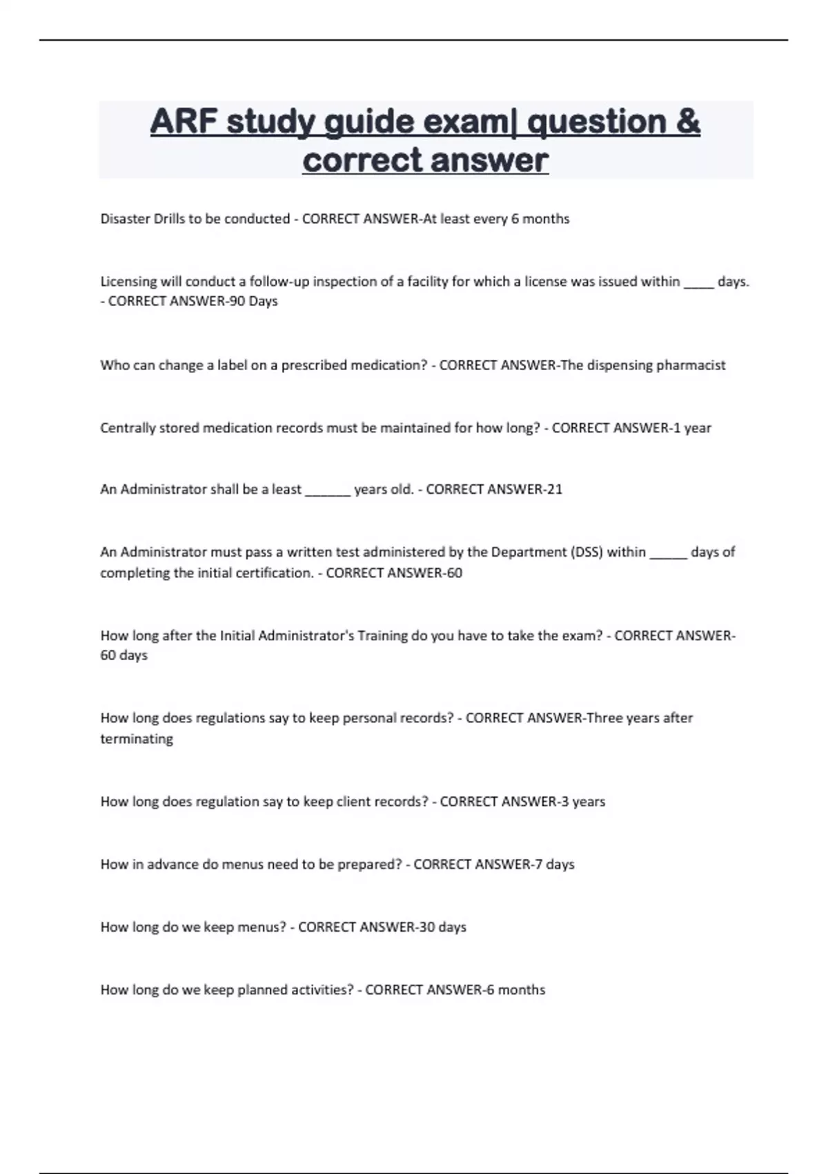 ARF study guide exam| question & correct answer Disaster Drills to be conducted - CORRECT ANSWER-At least every 6 months Licensing will conduct a follow-up inspection of a facility for which a license was issued within ____ days. - CORRECT ANSWER-90 Days Who can change a label on a prescribed medication? - CORRECT ANSWER-The dispensing pharmacist Centrally stored medication records must be maintained for how long? - CORRECT ANSWER-1 year