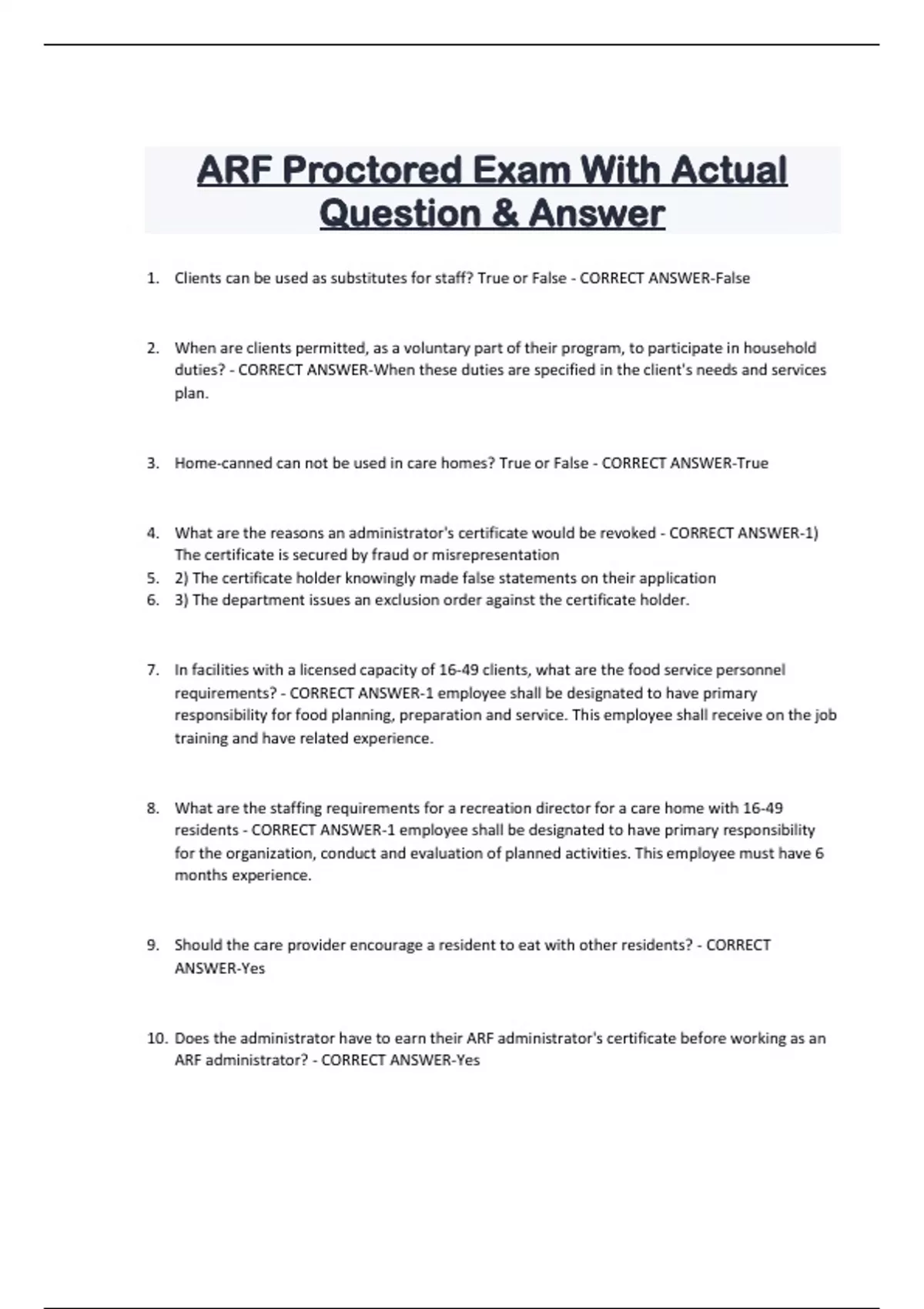 ARF Proctored Exam With Actual Question & Answer 1. Clients can be used as substitutes for staff? True or False - CORRECT ANSWER-False 2. When are clients permitted, as a voluntary part of their program, to participate in household duties? - CORRECT ANSWER-When these duties are specified in the client's needs and services plan. 3. Home-canned can not be used in care homes? True or False - CORRECT ANSWER-True