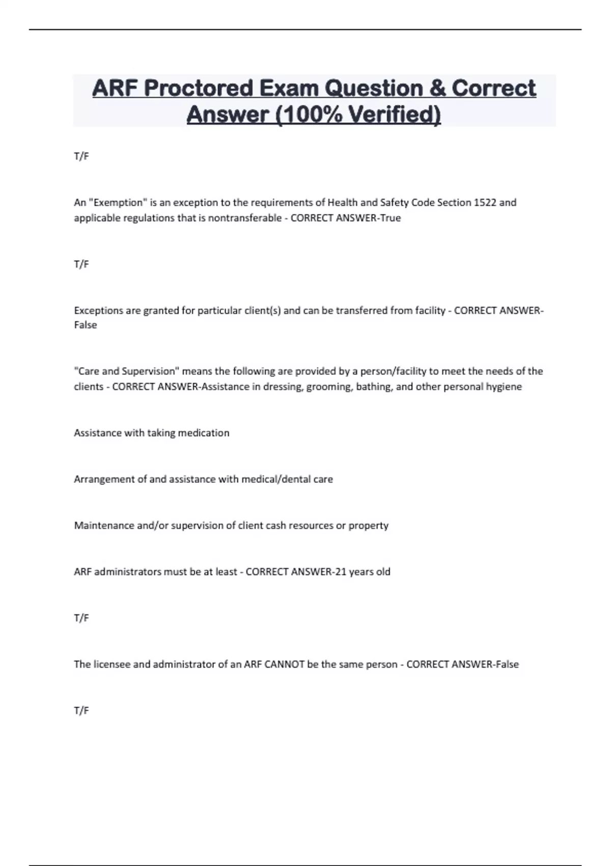 ARF Proctored Exam Question & Correct Answer (100% Verified) T/F An "Exemption" is an exception to the requirements of Health and Safety Code Section 1522 and applicable regulations that is nontransferable - CORRECT ANSWER-True T/F Exceptions are granted for particular client(s) and can be transferred from facility - CORRECT ANSWERFalse "Care and Supervision" means the following are provided by a person/facility to meet the needs of the clients - CORRECT ANSWER-Assistance in dressing, grooming, bathing, and other personal hygiene