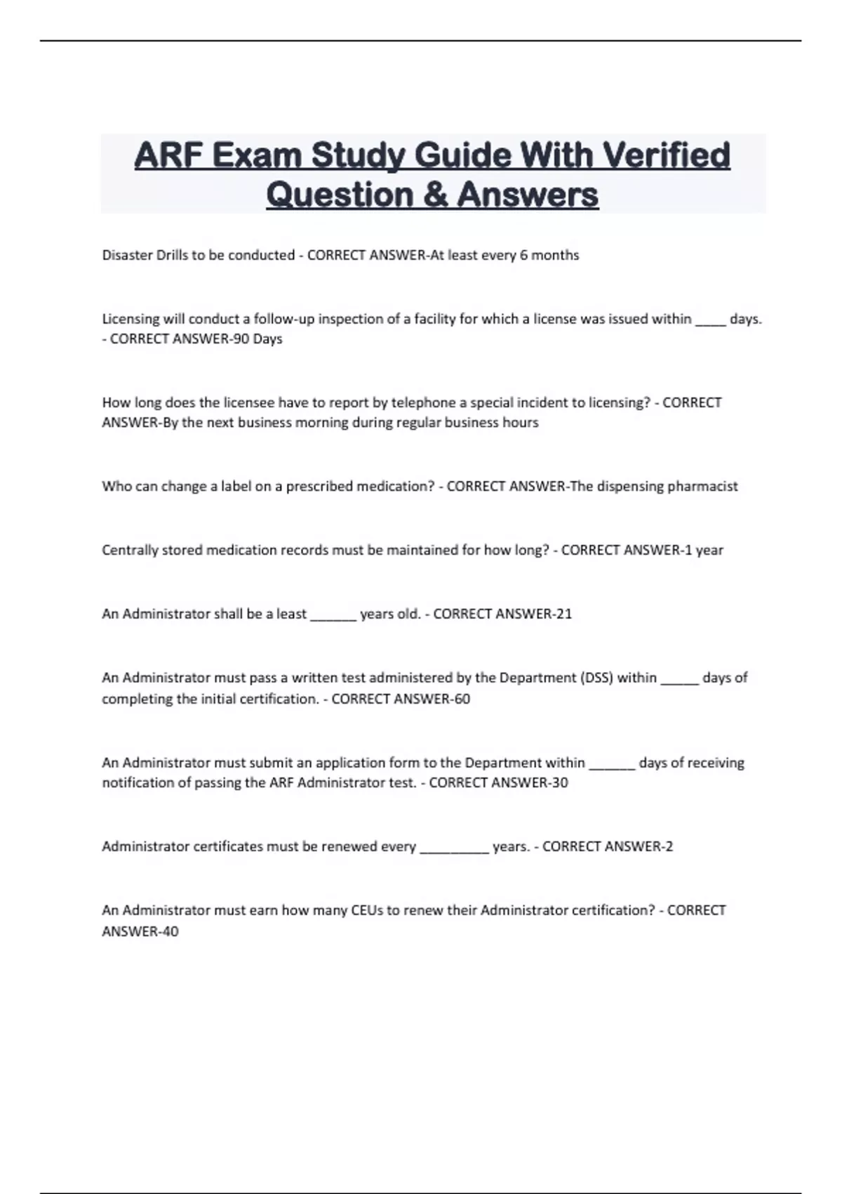 ARF Exam Study Guide With Verified Question & Answers Disaster Drills to be conducted - CORRECT ANSWER-At least every 6 months Licensing will conduct a follow-up inspection of a facility for which a license was issued within ____ days. - CORRECT ANSWER-90 Days How long does the licensee have to report by telephone a special incident to licensing? - CORRECT ANSWER-By the next business morning during regular business hours