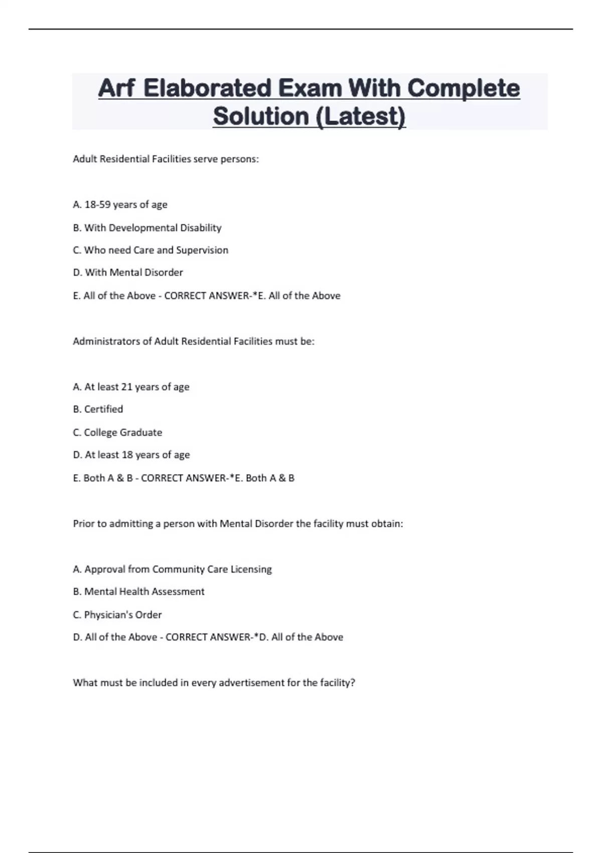 Arf Elaborated Exam With Complete Solution (Latest) Adult Residential Facilities serve persons: A. 18-59 years of age B. With Developmental Disability C. Who need Care and Supervision D. With Mental Disorder E. All of the Above - CORRECT ANSWER-*E. All of the Above