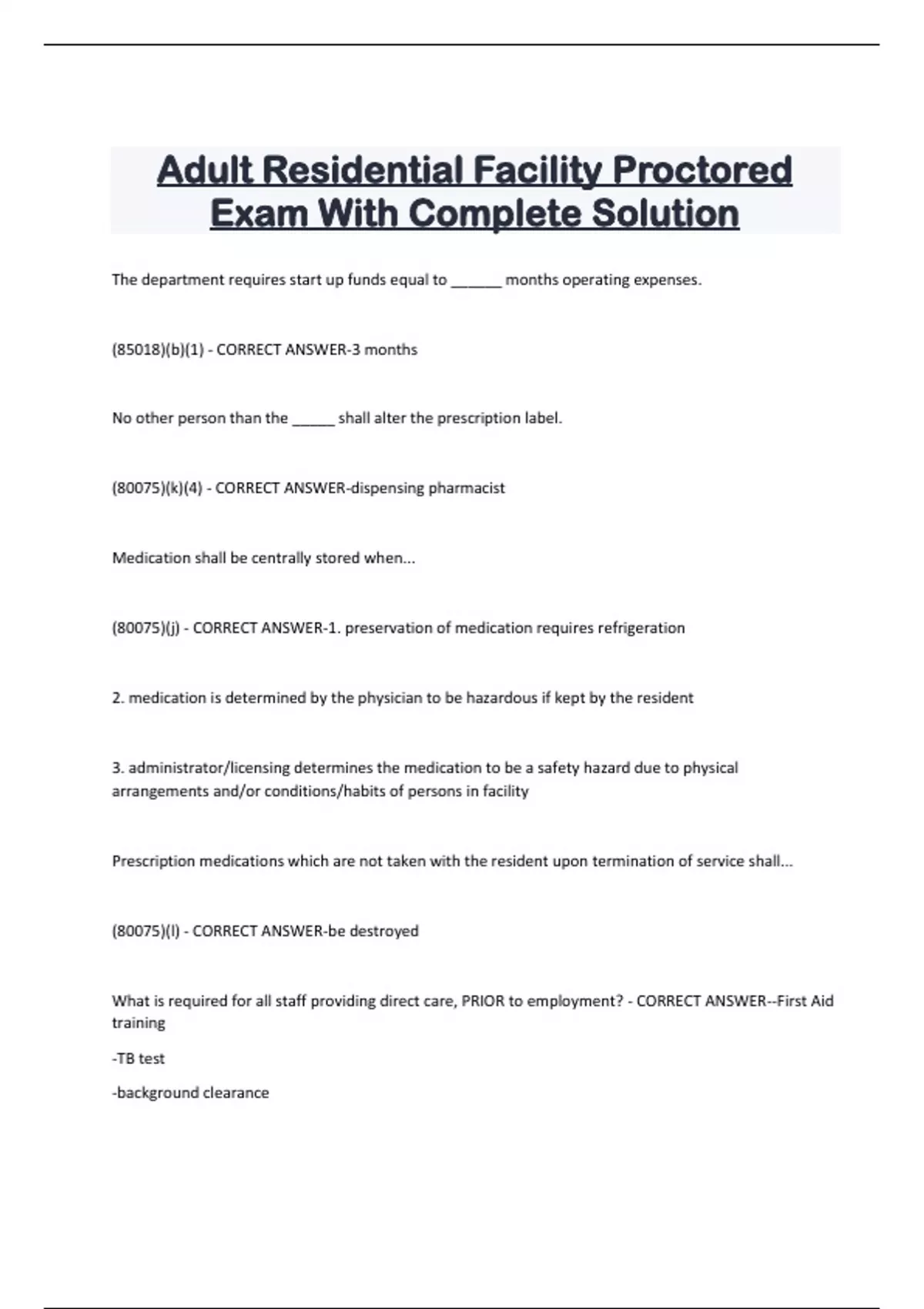 Adult Residential Facility Proctored Exam With Complete Solution The department requires start up funds equal to ______ months operating expenses. (85018)(b)(1) - CORRECT ANSWER-3 months No other person than the _____ shall alter the prescription label. (80075)(k)(4) - CORRECT ANSWER-dispensing pharmacist