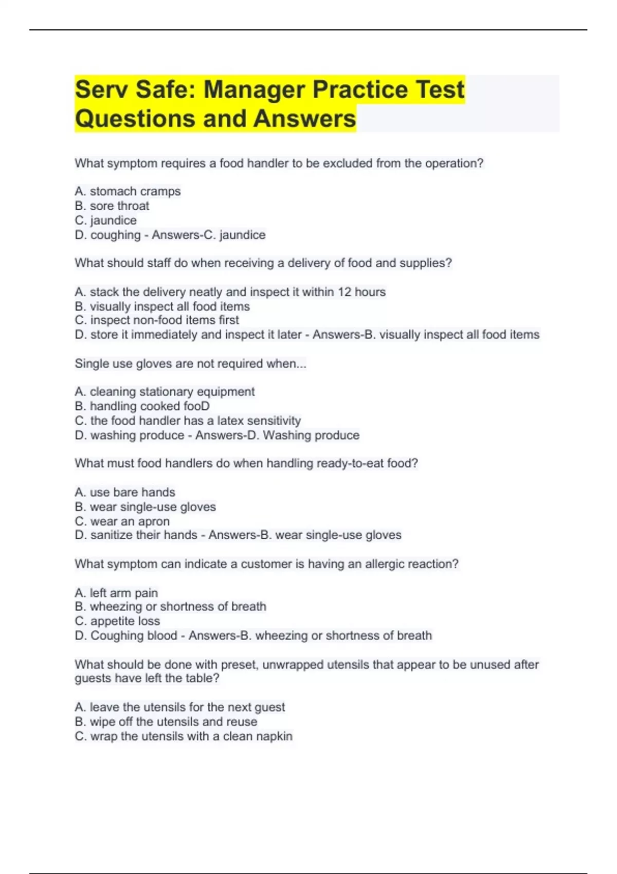 What symptom requires a food handler to be excluded from the operation? A. stomach cramps B. sore throat C. jaundice D. coughing - Answers-C. jaundice What should staff do when receiving a delivery of food and supplies? A. stack the delivery neatly and inspect it within 12 hours B. visually inspect all food items C. inspect non-food items first D. store it immediately and inspect it later - Answers-B. visually inspect all food items Single use gloves are not required when... A. cleaning stationary equipment B. handling cooked fooD C. the food handler has a latex sensitivity D. washing produce - Answers-D. Washing produce What must food handlers do when handling ready-to-eat food? A. use bare hands B. wear single-use gloves C. wear an apron D. sanitize their hands - Answers-B. wear single-use gloves What symptom can indicate a customer is having an allergic reaction? A. left arm pain B. wheezing or shortness of breath C. appetite loss D. Coughing blood - Answers-B. wheezing or shortness of breath What should be done with preset, unwrapped utensils that appear to be unused after guests have left the table? A. leave the utensils for the next guest B. wipe off the utensils and reuse C. wrap the utensils with a clean napkin