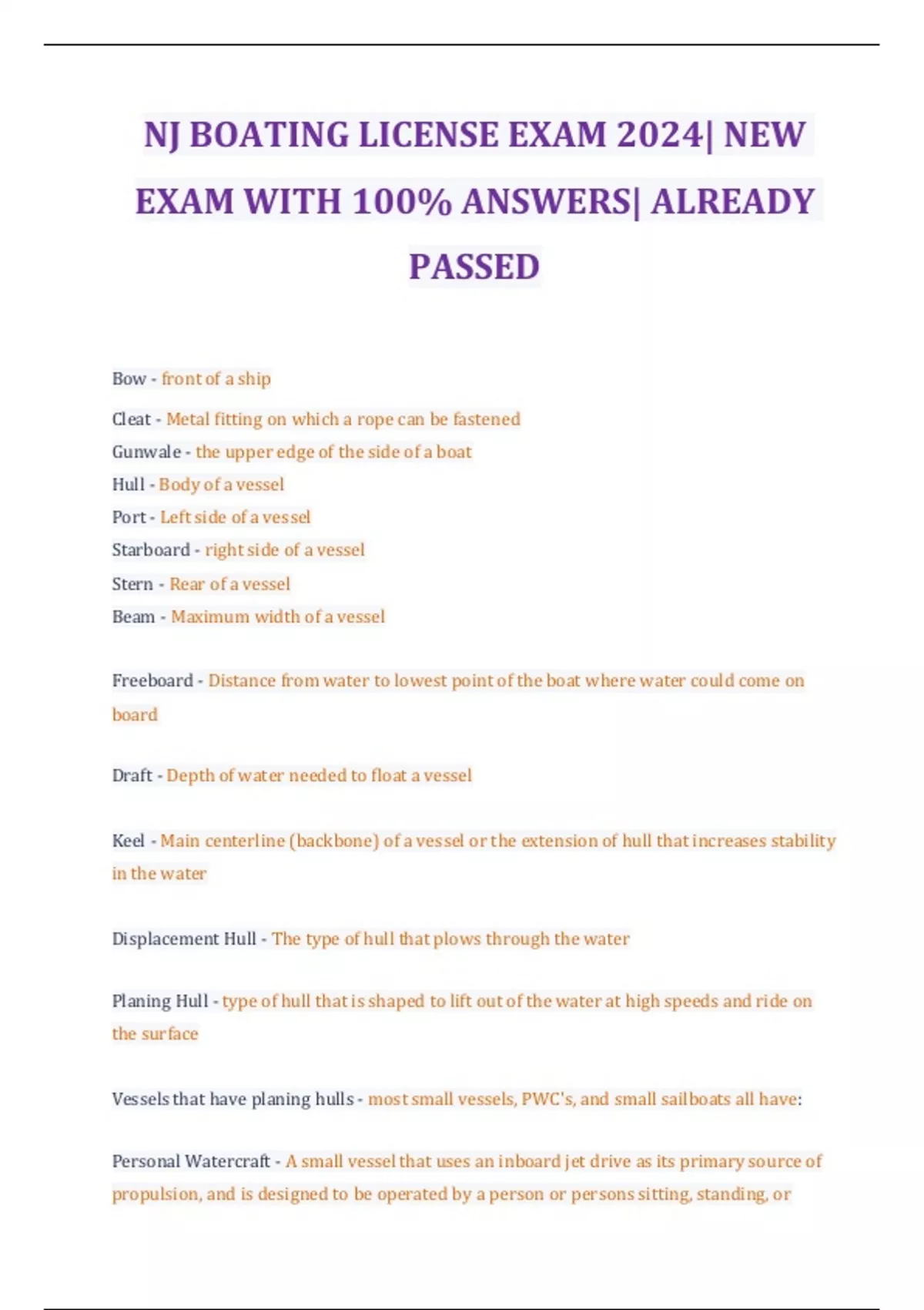 NJ BOATING LICENSE EXAM 2024| NEW EXAM WITH 100% ANSWERS| ALREADY PASSED Bow - front of a ship Cleat - Metal fitting on which a rope can be fastened Gunwale - the upper edge of the side of a boat Hull - Body of a vessel Port - Left side of a vessel Starboard - right side of a vessel Stern - Rear of a vessel Beam - Maximum width of a vessel Freeboard - Distance from water to lowest point of the boat where water could come on board Draft - Depth of water needed to float a vessel Keel - Main centerline (backbone) of a vessel or the extension of hull that increases stability in the water Displacement Hull - The type of hull that plows through the water Planing Hull - type of hull that is shaped to lift out of the water at high speeds and ride on the surface Vessels that have planing hulls - most small vessels, PWC's, and small sailboats all have: