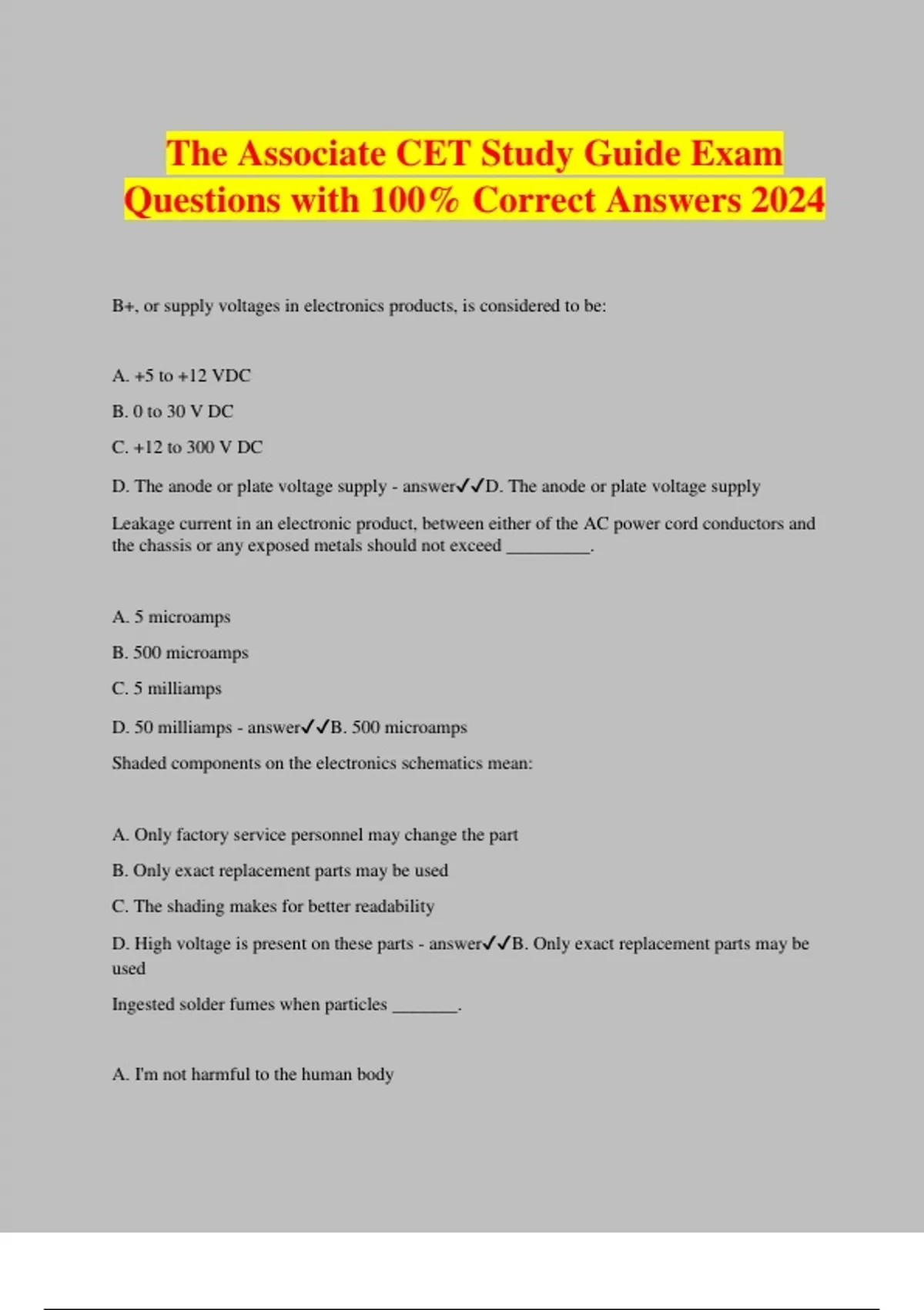 The Associate CET Study Guide Exam Questions with 100% Correct Answers 2024 B+, or supply voltages in electronics products, is considered to be: A. +5 to +12 VDC B. 0 to 30 V DC C. +12 to 300 V DC D. The anode or plate voltage supply - answerD. The anode or plate voltage supply Leakage current in an electronic product, between either of the AC power cord conductors and the chassis or any exposed metals should not exceed _________. A. 5 microamps B. 500 microamps C. 5 milliamps D. 50 milliamps - answerB. 500 microamps Shaded components on the electronics schematics mean: A. Only factory service personnel may change the part B. Only exact replacement parts may be used C. The shading makes for better readability D. High voltage is present on these parts - answerB. Only exact replacement parts may be used Ingested solder fumes when particles _______. A. I'm not harmful to the human body B. Are toxic C. From lead-tin solder aren't harmful D. From tin-alloys are most harmful - answerB. Are toxic Second degree skin burns should ________. A. Not be treated with ice and bandage pack B. Be covered with thick bandages C. Be treated with cold water or ice D. Be treated by draining blisters - answerA. Not be treated with ice and bandage pack Rules describing the fire or toxicity retardant types of cabling which may be installed in buildings is contained in _________. A. NEC Article 770 B. UL 569B C. TIA/EIA standard 578 D. NEMA code 1316 - answerA. NEC Article 770 ESD and static discharge is most destructive to _______. A. CMOS semiconductors B. TTL semiconductors C. Germanium PN junctions D. Silicon PN junctions - answerA. CMOS semiconductors If you have never receive formal training and practice CPR want a pricing or dummy, in the event of finding a fellow worker not breathing, you _________. A. Should use what knowledge you do half of the procedure and attempt it B. Should not attempt it, but call for help C. Should attempt it after calling for help D. Should, if handy, read the instructions and attempt in order to save the life - answerB. Should not attempt it, but call for help When working at heights above 6 feet, a ________ is required by OSHA rules. A. Linesman's belt B. Linesman's belt attached to a lanyard C. Full body harness attached to a lanyard that prevents more than a 6 foot drop D. Good insurance policy - answerC. Full body harness attached to a lanyard that prevents more than a 6 foot drop 'Phantom' current is associated with ________. A. Northern Lights B. Corona arcing from electrical generators C. Charge retained by inductors D. Charge retained by capacitors - answerD. Charge retained by capacitors The atomic number of an element is the same as the element's atomic weight. A. True B. False - answerB. False An increase in the voltage with resistance held constant causes current to __________. A. Decrease B. Increase twice to value of voltage C. Increase D. None of the above - answerC. Increase The ampere, expresses __________. A. Volts/sec increase B. A unit of charge movement per second past a given point C. Coulombs/charge D. An increase in resistance - answerB. A unit of charge movement per second past a given point The total resistance of a parallel circuit containing equal branch resistances is found by the following: A. By adding all of the branch resistance values B. By taking the product of all the branch resistance values C. By dividing the resistance value of a branch by the number of branches D. The value cannot be found - answerC. By dividing the resistance value of a branch by the number of branches A 12 V DC power supply has a 15 ohm internal resistance. What load resistance can you be connected to transfer maximum power? A. 15 ohms B. 20 ohms C. 10 ohms D. 5 ohms - answerA. 15 ohms Maximum power transfer occurs when the low impedance is equal to the source impedance. A. True B. False - answerA. True What will happen to the current through the resistor if the resistor value increases? A. Current increases B. Current remains unchanged C. Current decreases D. Car and the voltage across the resistor increases - answerC. Current decreases