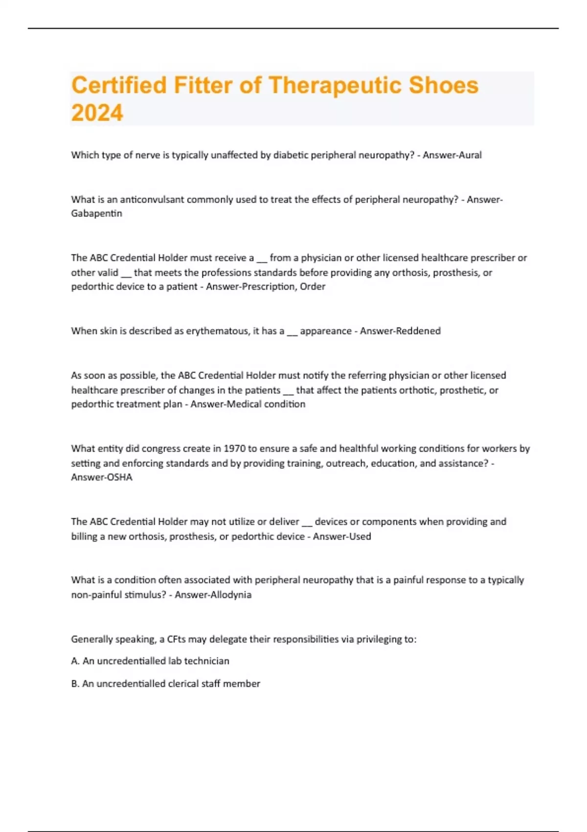 Which type of nerve is typically unaffected by diabetic peripheral neuropathy? - Answer-Aural What is an anticonvulsant commonly used to treat the effects of peripheral neuropathy? - AnswerGabapentin The ABC Credential Holder must receive a __ from a physician or other licensed healthcare prescriber or other valid __ that meets the professions standards before providing any orthosis, prosthesis, or pedorthic device to a patient - Answer-Prescription, Order When skin is described as erythematous, it has a __ appareance - Answer-Reddened As soon as possible, the ABC Credential Holder must notify the referring physician or other licensed healthcare prescriber of changes in the patients __ that affect the patients orthotic, prosthetic, or pedorthic treatment plan - Answer-Medical condition What entity did congress create in 1970 to ensure a safe and healthful working conditions for workers by setting and enforcing standards and by providing training, outreach, education, and assistance? - Answer-OSHA The ABC Credential Holder may not utilize or deliver __ devices or components when providing and billing a new orthosis, prosthesis, or pedorthic device - Answer-Used What is a condition often associated with peripheral neuropathy that is a painful response to a typically non-painful stimulus? - Answer-Allodynia Generally speaking, a CFts may delegate their responsibilities via privileging to: A. An uncredentialled lab technician B. An uncredentialled clerical staff memberC. A referring physician D. None of the above - Answer-None of the above The ABC Credential Holder has the responsibility to conduct himself/herself in a manner that will assure the __ of the profession - Answer-Dignity and status In the United States, and several other countries, the concentration of glucose in the blood is measured how? - Answer-Milligrams per deciliter What nerves are found in the foot and ankle? - Answer-Superficial and deep peroneal nerves, medical and lateral plantar nerves, and sural and saphenous nerves The anterior tibial tendon, extensor hallicus, and __ serve to dorsiflex the foot - Answer-Extensosr digitorum longus The __, through the action of the Achilles Tendon, is the strongest hind foot inverter - Answer-Triceps Surae Muscle What does the therapeutic shoe fitters treatment NOT include? - Answer-Design, material selection, fabrication, and modification of the shoe inserts The junction between the upper and two-thirds and lower one-thirds of the leg, the __ nerve is divided into medial dorsal cutaneous nerve and intermediate dorsal cutaneous nerve - Answer-Superficial peroneal nerve How many nerve endings are in the foot? - Answer-Over 7000 What style shoe has open lacing with shoe lace tabs sewn on top as opposed to being one with the vamp? - Answer-Blucher A shoe sole that is 1/4" which is __ irons thick - Answer-36The HCPCS code for a heat-moldable diabetic shoe insert that has been neither heated or molded is? - Answer-A5510 The "Place of Service" code used when billing therapeutic footwear to Medicare is "12", or __? - AnswerHome The sesamoid bones lie within what tendon? - Answer-Flexor Hallicus Brevis What is the immovable joint between the tibia and the fibula at the ankle called? - Answer-Syndesmosis What is a strip of leather around the edge of the sole to which the upper is attached? - Answer-Welt What is a structural stiffener added to the sole of a shoe and can be made of steel, fiberglass, nylon, and Kevlar graphite composites? - Answer-Shank What is known to be a very soft, supple, stretchable leather but does not hold up as well to extended wear compared to calf skin? - Answer-Deerskin HCPCS - Answer-Healthcare Common Procedure Coding System The codes contained in the 10th revision of the International Statistical Classification of Diseases and Related Health Problems system are more commonly referred to as? - Answer-ICD-10 Codes The ABC certified fitter-therapeutic shoes is bound by the ABC Code of Professional Responsibility which is enforced by a __ program - Answer-Professional Discipline Directly or indirectly asking for the patronage or individual patients by way of: (i) of intimidation, threats, harassing conduct, undue influence, coercion, duress; and/or (ii) remnuneration, unwarranted promises of benefits, or in violation of any third party payer rules is known as __ and is prohibited by the ABC Code of Conduct - Answer-Solicitation Strain - Answer-Stretched or toen tendon/muscleWhat must the CFts meet in order to obtain and retain his/her Medicare billing privileges? - AnswerMedicare DMEPOS Supplier Standards