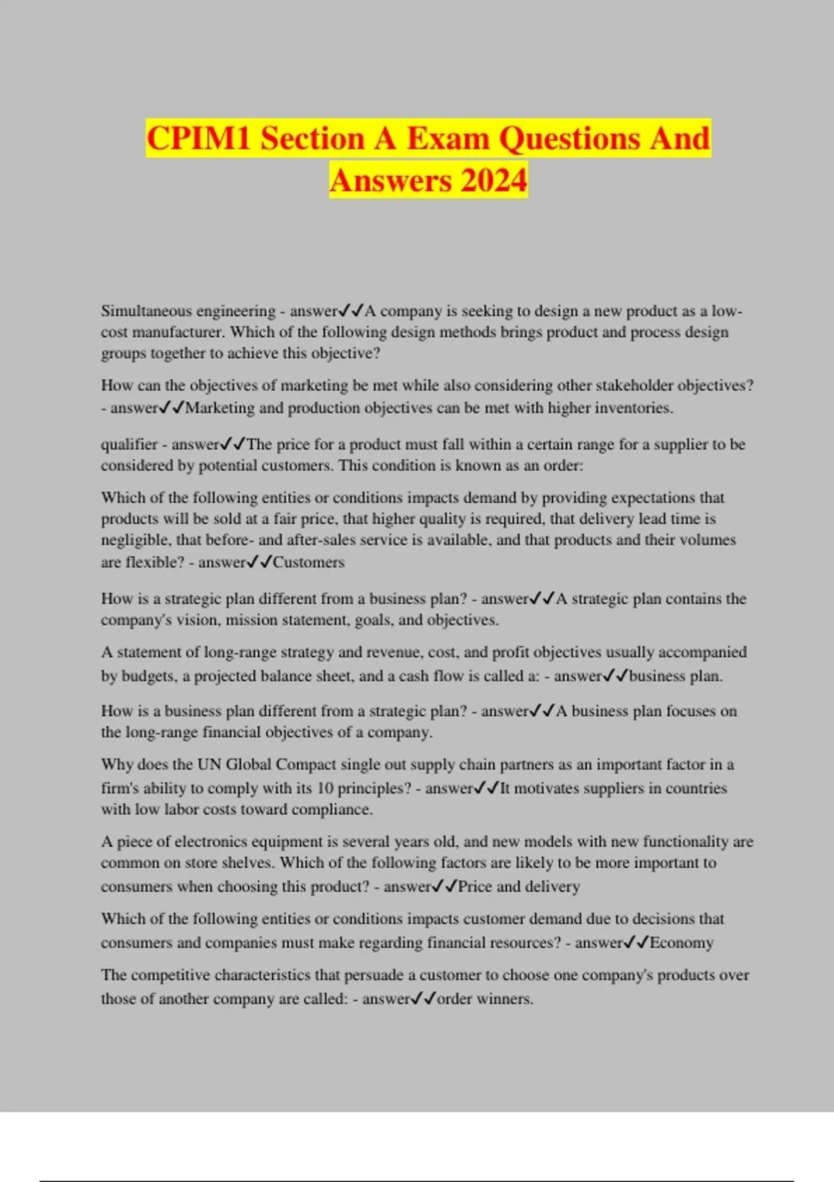 CPIM1 Section A Exam Questions And Answers 2024 Simultaneous engineering - answerA company is seeking to design a new product as a low- cost manufacturer. Which of the following design methods brings product and process design groups together to achieve this objective? How can the objectives of marketing be met while also considering other stakeholder objectives? - answerMarketing and production objectives can be met with higher inventories. qualifier - answerThe price for a product must fall within a certain range for a supplier to be considered by potential customers. This condition is known as an order: Which of the following entities or conditions impacts demand by providing expectations that products will be sold at a fair price, that higher quality is required, that delivery lead time is negligible, that before- and after-sales service is available, and that products and their volumes are flexible? - answerCustomers How is a strategic plan different from a business plan? - answerA strategic plan contains the company's vision, mission statement, goals, and objectives. A statement of long-range strategy and revenue, cost, and profit objectives usually accompanied by budgets, a projected balance sheet, and a cash flow is called a: - answerbusiness plan. How is a business plan different from a strategic plan? - answerA business plan focuses on the long-range financial objectives of a company. Why does the UN Global Compact single out supply chain partners as an important factor in a firm's ability to comply with its 10 principles? - answerIt motivates suppliers in countries with low labor costs toward compliance. A piece of electronics equipment is several years old, and new models with new functionality are common on store shelves. Which of the following factors are likely to be more important to consumers when choosing this product? - answerPrice and delivery Which of the following entities or conditions impacts customer demand due to decisions that consumers and companies must make regarding financial resources? - answerEconomy The competitive characteristics that persuade a customer to choose one company's products over those of another company are