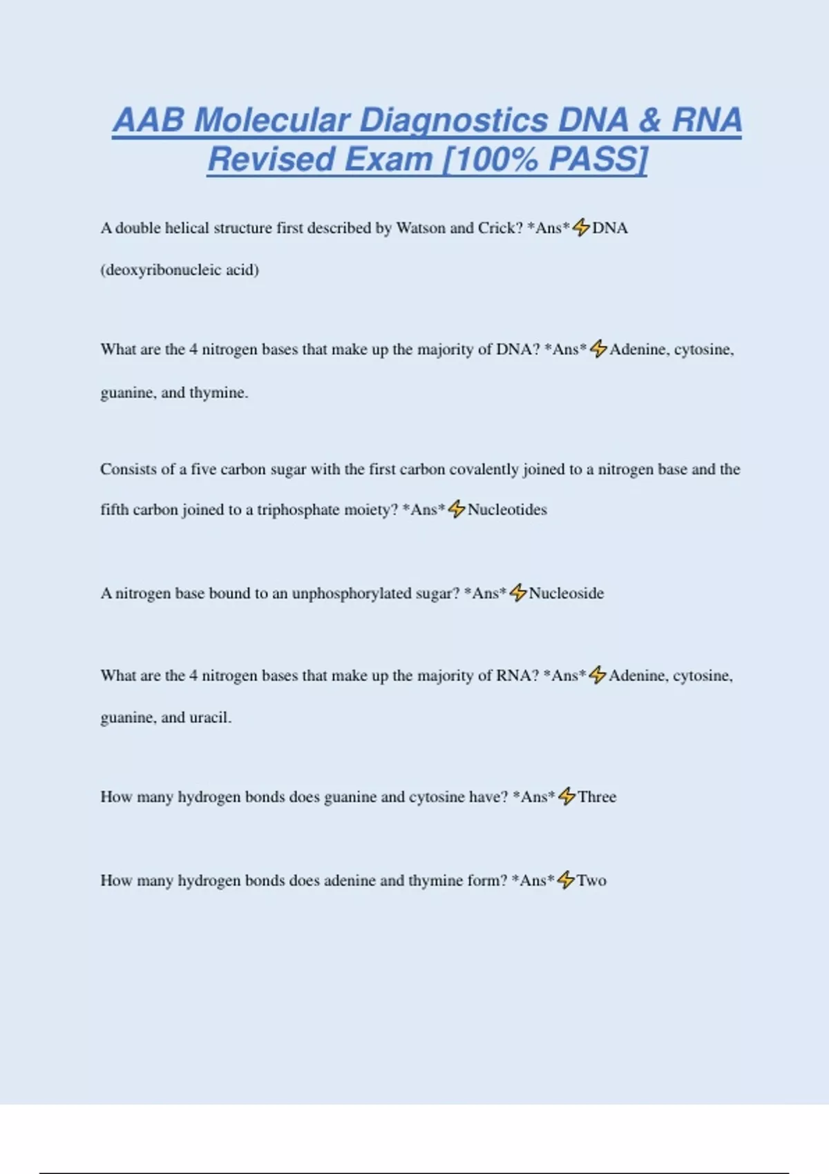 AAB Molecular Diagnostics DNA & RNA Revised Exam [100% PASS] A double helical structure first described by Watson and Crick? *Ans* DNA (deoxyribonucleic acid) What are the 4 nitrogen bases that make up the majority of DNA? *Ans* Adenine, cytosine, guanine, and thymine. Consists of a five carbon sugar with the first carbon covalently joined to a nitrogen base and the fifth carbon joined to a triphosphate moiety? *Ans* Nucleotides A nitrogen base bound to an unphosphorylated sugar? *Ans* Nucleoside What are the 4 nitrogen bases that make up the majority of RNA? *Ans* Adenine, cytosine, guanine, and uracil. How many hydrogen bonds does guanine and cytosine have? *Ans* Three How many hydrogen bonds does adenine and thymine form? *Ans* Two
