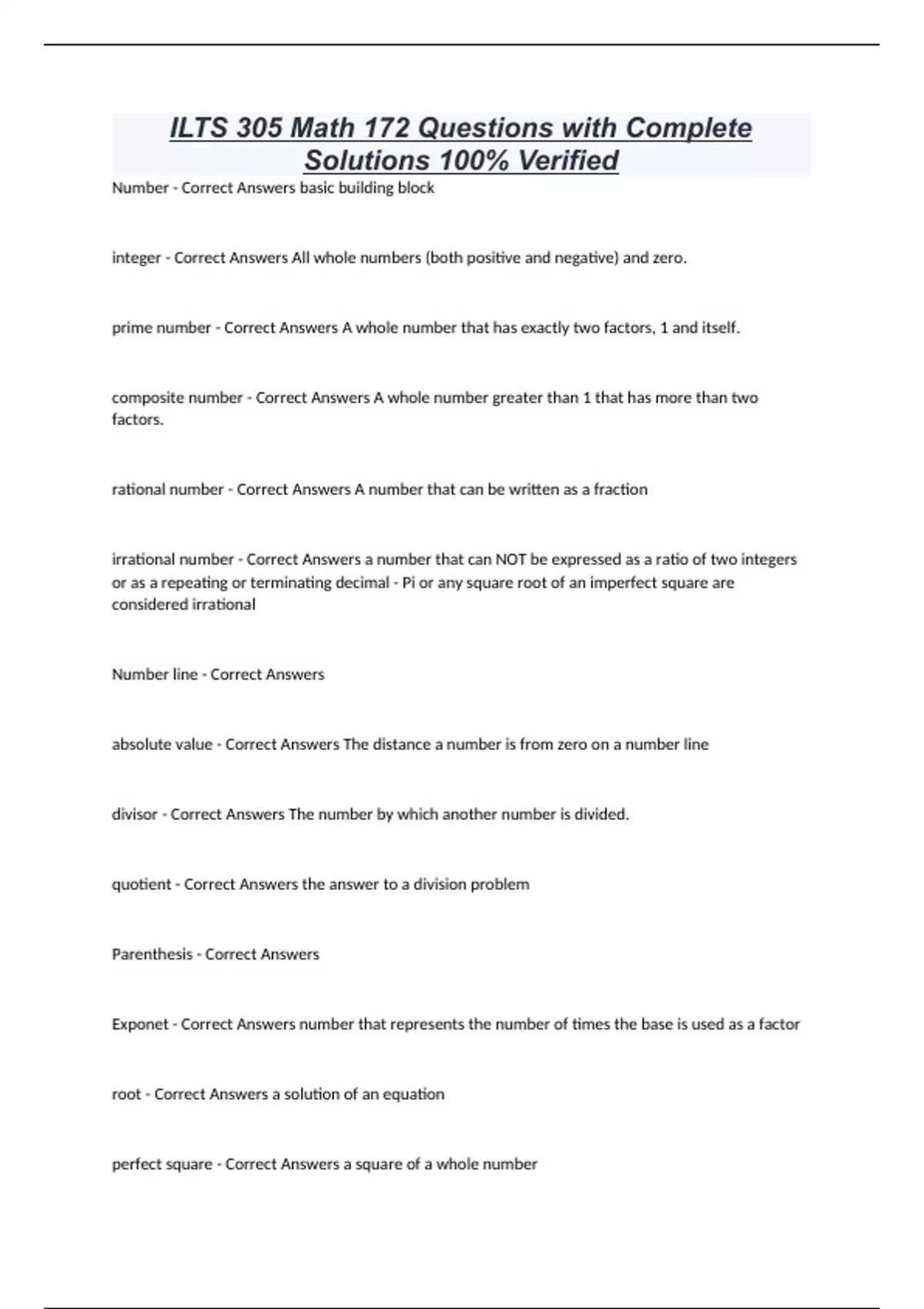 ILTS 305 Math 172 Questions with Complete Solutions 100% Verified Number - Correct Answers basic building block integer - Correct Answers All whole numbers (both positive and negative) and zero. prime number - Correct Answers A whole number that has exactly two factors, 1 and itself. composite number - Correct Answers A whole number greater than 1 that has more than two factors. rational number - Correct Answers A number that can be written as a fraction irrational number - Correct Answers a number that can NOT be expressed as a ratio of two integers or as a repeating or terminating decimal - Pi or any square root of an imperfect square are considered irrational Number line - Correct Answers absolute value - Correct Answers The distance a number is from zero on a number line divisor - Correct Answers The number by which another number is divided. quotient - Correct Answers the answer to a division problem Parenthesis - Correct Answers Exponet - Correct Answers number that represents the number of times the base is used as a factor root - Correct Answers a solution of an equation perfect square - Correct Answers a square of a whole number