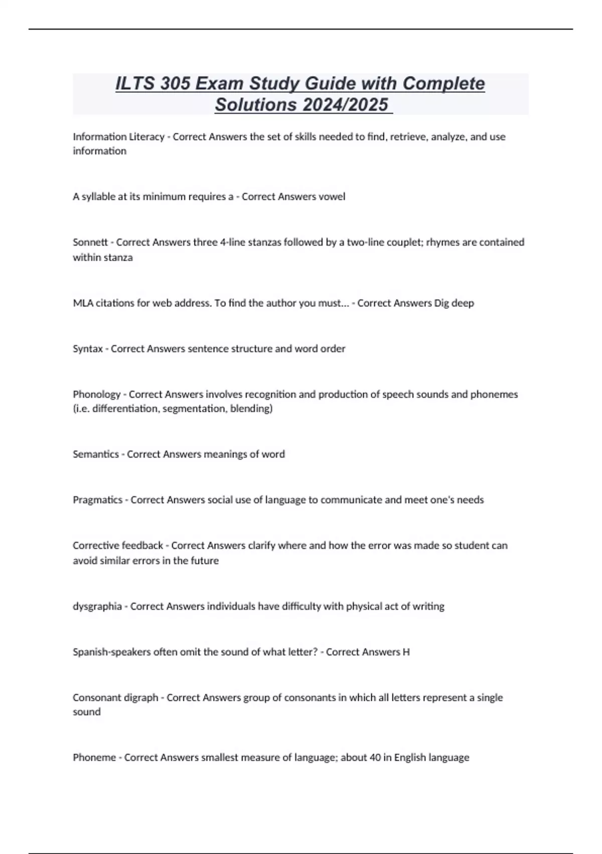 ILTS 305 Exam Study Guide with Complete Solutions 2024/2025 Information Literacy - Correct Answers the set of skills needed to find, retrieve, analyze, and use information A syllable at its minimum requires a - Correct Answers vowel Sonnett - Correct Answers three 4-line stanzas followed by a two-line couplet; rhymes are contained within stanza MLA citations for web address. To find the author you must... - Correct Answers Dig deep Syntax - Correct Answers sentence structure and word order Phonology - Correct Answers involves recognition and production of speech sounds and phonemes (i.e. differentiation, segmentation, blending) Semantics - Correct Answers meanings of word Pragmatics - Correct Answers social use of language to communicate and meet one's needs Corrective feedback - Correct Answers clarify where and how the error was made so student can avoid similar errors in the future dysgraphia - Correct Answers individuals have difficulty with physical act of writing Spanish-speakers often omit the sound of what letter? - Correct Answers H Consonant digraph - Correct Answers group of consonants in which all letters represent a single sound Phoneme - Correct Answers smallest measure of language; about 40 in English language -composed of individual letters