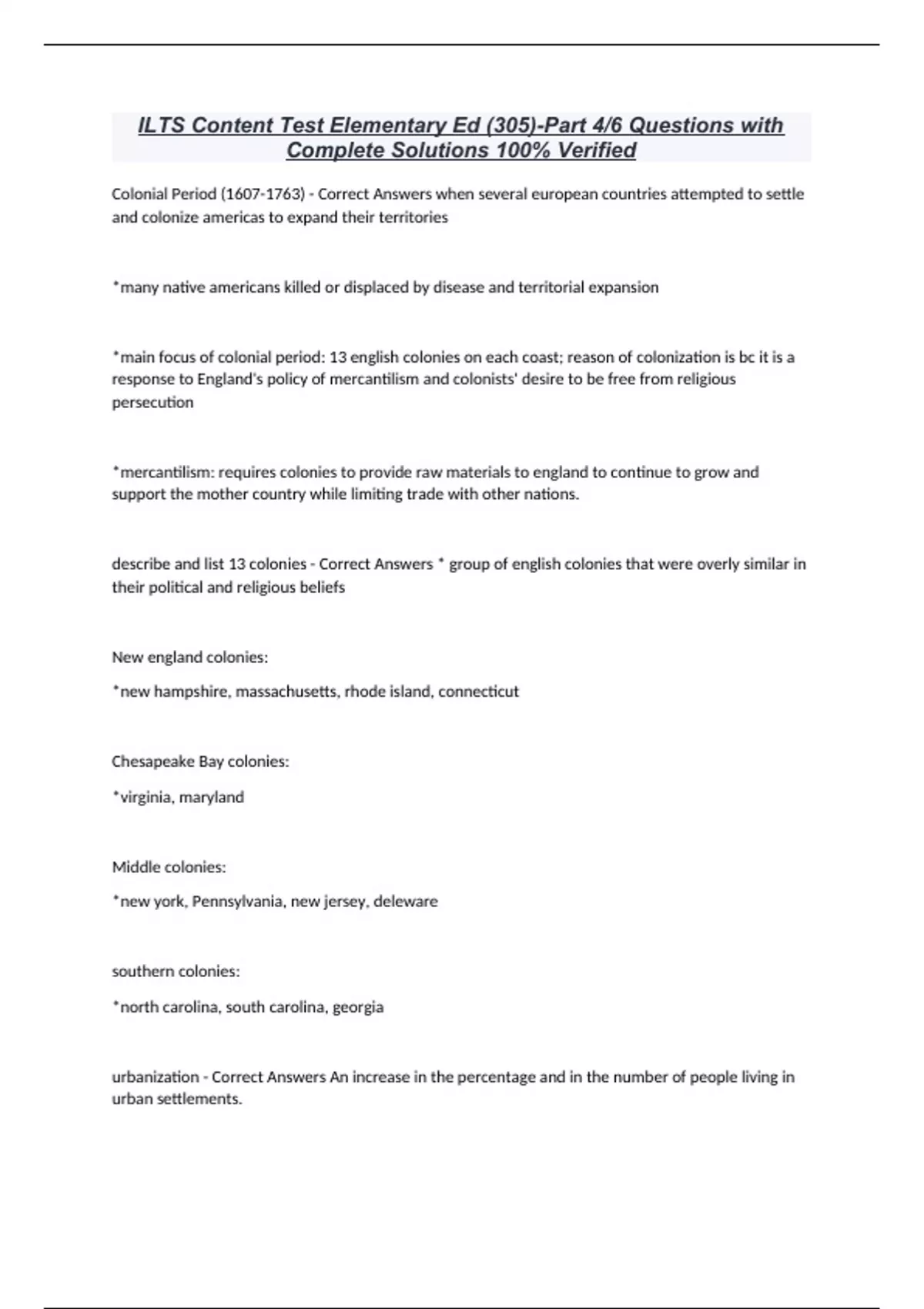 ILTS Content Test Elementary Ed (305)-Part 4/6 Questions with Complete Solutions 100% Verified Colonial Period () - Correct Answers when several european countries attempted to settle and colonize americas to expand their territories *many native americans killed or displaced by disease and territorial expansion *main focus of colonial period: 13 english colonies on each coast; reason of colonization is bc it is a response to England's policy of mercantilism and colonists' desire to be free from religious persecution *mercantilism: requires colonies to provide raw materials to england to continue to grow and support the mother country while limiting trade with other nations. describe and list 13 colonies - Correct Answers * group of english colonies that were overly similar in their political and religious beliefs New england colonies: *new hampshire, massachusetts, rhode island, connecticut Chesapeake Bay colonies: *virginia, maryland Middle colonies: *new york, Pennsylvania, new jersey, deleware southern colonies: *north carolina, south carolina, georgia urbanization - Correct Answers An increase in the percentage and in the number of people living in urban settlements. general economic, environmental and health effects of urbanization - Correct Answers *economically: can drastically raise expenses, frequently excluding local working class citizens *environmentally: urban heat islands raise temperatures and lower reabsorption of CO2 emission and soil moisture *changes are projected to strain food resources, sanitation and health care systems in the near future general positive and negative health effects on humans from urbanizations - Correct Answers *mortality from non communicable lifestyle-related diseases has increased through urbanization *mixed: relieve some problems while exacerbating others *high risk of being overweight *low risk of being malnourished or undernourished some census statistics on urban populations in Illinois that reflect: 1) the rates at which urbanization has progressed by decade from and 2) the eight cities in Illinois with the largest populations as of 2010 - Correct Answers 1) in 1870=23.5%; in 1880=30.6%; in 1890=44.9%; 1900=54.3%; 1910=61.7%; 1920=67.9%; 1930=73.9% ;1940=73.6% ;1950=77.6% ; 1960=80.7%; 1970=83.2% ; 1980=83.3% ; 1990=86.4% ; 2000=87.8%; 2010= 88.5% 2) chicago, aurora, rockford, joliet, naperville, springfield, peoria, elgin some facts about several natural distasters in Illinois during the 20th and 21st century and their effects - Correct Answers 1967: chicago blizzard hit northeast illinois and northwest indiana with record 23 inches of snow(history's worst blizzard) 1995: chicago's heat wave with record temperature in july up to 106ºF April&May 2011:Mississippi River floods caused by record rainfall were the biggest and most destructive on that river in 100 years affecting illinois and 6 other states several years when earthquakes occurred in illinois. report some major snow, ice, rainstorms and floods affecting illinois during the 20th and 21st century and some of their significant impacts on human life - Correct Answers years with earthquakes: 1838, 1891, 1909, 1917, 1968, 1972, 1987, 2004, 2008, 2010, 2013