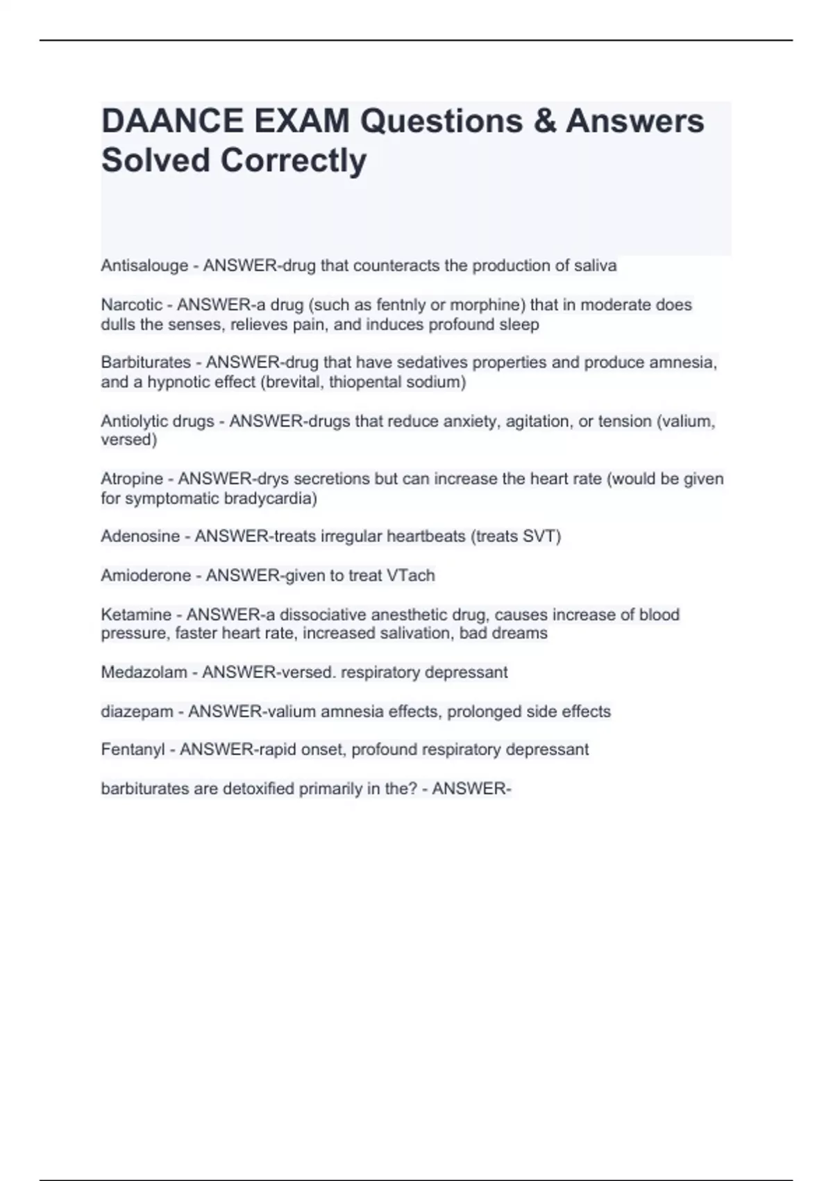 Narcotic - ANSWER-a drug (such as fentnly or morphine) that in moderate does dulls the senses, relieves pain, and induces profound sleep Barbiturates - ANSWER-drug that have sedatives properties and produce amnesia, and a hypnotic effect (brevital, thiopental sodium) Antiolytic drugs - ANSWER-drugs that reduce anxiety, agitation, or tension (valium, versed) Atropine - ANSWER-drys secretions but can increase the heart rate (would be given for symptomatic bradycardia) Adenosine - ANSWER-treats irregular heartbeats (treats SVT) Amioderone - ANSWER-given to treat VTach Ketamine - ANSWER-a dissociative anesthetic drug, causes increase of blood pressure, faster heart rate, increased salivation, bad dreams Medazolam - ANSWER-versed. respiratory depressant diazepam - ANSWER-valium amnesia effects, prolonged side effects Fentanyl - ANSWER-rapid onset, profound respiratory depressant barbiturates are detoxified primarily in the? - ANSWER-