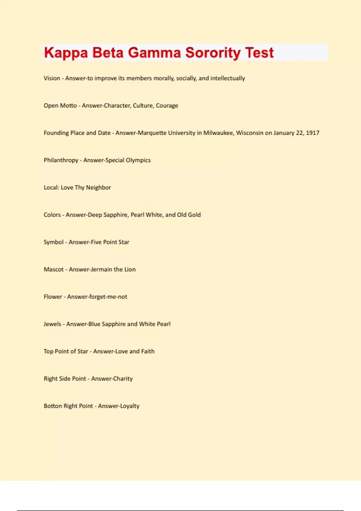 Vision - Answer-to improve its members morally, socially, and intellectually Open Motto - Answer-Character, Culture, Courage Founding Place and Date - Answer-Marquette University in Milwaukee, Wisconsin on January 22, 1917 Philanthropy - Answer-Special Olympics Local: Love Thy Neighbor Colors - Answer-Deep Sapphire, Pearl White, and Old Gold Symbol - Answer-Five Point Star Mascot - Answer-Jermain the Lion Flower - Answer-forget-me-not Jewels - Answer-Blue Sapphire and White Pearl Top Point of Star - Answer-Love and Faith Right Side Point - Answer-Charity Botton Right Point - Answer-LoyaltyBottom Left Point - Answer-Sisterhood Left Side Point - Answer-Fidelity Official Founder's Day - Answer-January 22, 1917 Number of Founding sisters? - Answer-12 Founding Recorder (Secretary) - Answer-Jeannie Lee Founding Treasurer - Answer-Mary Weimar Founding Mistress (Vice President) - Answer-Myra Thewalt Founding Grand Mistress (President) - Answer-Teresa Jermain Marquette Chapter - Answer-Beta Chapter National Founder's Day - Answer-May 14, 1947 St. Louis University Chapter - Answer-Alpha Chapter International Founder's Day - Answer-April 2, 2011 University of Victoria in British Colombus, Canada - Answer-Epsilon Chapter Konnvention - Answer-first weekend of august Grand Council - Answer-Board of Directors for KBGCEO - Answer-Tonya Niemi CFO - Answer-Allison Simmerlein COO - Answer-Lacy Dickel National Officers - Answer-3 and two more additional positions Active Compliance Officer - Answer-Elizabeth Jensen Active Operations Officer - Answer-Jessica Zerchuche Active Membership Officer - Answer-Jae Allaim DEI - Answer-Shay Trizie Wellness Chair - Answer-Jade Robelda Love and Faith - Answer-two pillars of foundation Sisterhood - Answer-Foundation of sorority. true unity of women