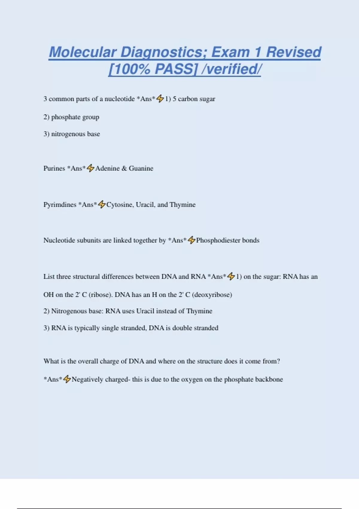 Molecular Diagnostics; Exam 1 Revised [100% PASS] /verified/ 3 common parts of a nucleotide *Ans* 1) 5 carbon sugar 2) phosphate group 3) nitrogenous base Purines *Ans* Adenine & Guanine Pyrimdines *Ans* Cytosine, Uracil, and Thymine Nucleotide subunits are linked together by *Ans* Phosphodiester bonds List three structural differences between DNA and RNA *Ans* 1) on the sugar: RNA has an OH on the 2' C (ribose). DNA has an H on the 2' C (deoxyribose) 2) Nitrogenous base: RNA uses Uracil instead of Thymine 3) RNA is typically single stranded, DNA is double stranded What is the overall charge of DNA and where on the structure does it come from? *Ans* Negatively charged- this is due to the oxygen on the phosphate backbone What is the difference between the leading and the lagging strand in DNA replication? *Ans* -Leading strand is the continuous strand that copies in the 5' to 3' direction of the opening double helix -Lagging strand discontinuosly copies the DNA in the 5' to 3' direction on the stran moving in the opposite direction of the opening double helix. This generates Okazaki fragments What enzyme opens up the two strands of DNA? *Ans* helicase Which direction is a DNA sequence always written *Ans* 5'-3' direction. If it was not standardized this would lead to incorrect interpretation of protein sequences and presentation of sequence data. What is a plasmid, and how does it differ from chromosomal DNA? *Ans* A plasmid is an extrachromosomal (not extraneous), circular piece of DNA found in bacteria. They cary genes that help bacteria survive in a wide range on environments. Write the complimentary sequence: 5' ATTGGCC 3' *Ans* 5' GGCCAAT 3' What is Ethidium Bromide? *Ans* an "intercalating agent" a flourescent dye that binds DNA Denaturing agents *Ans* -formamid