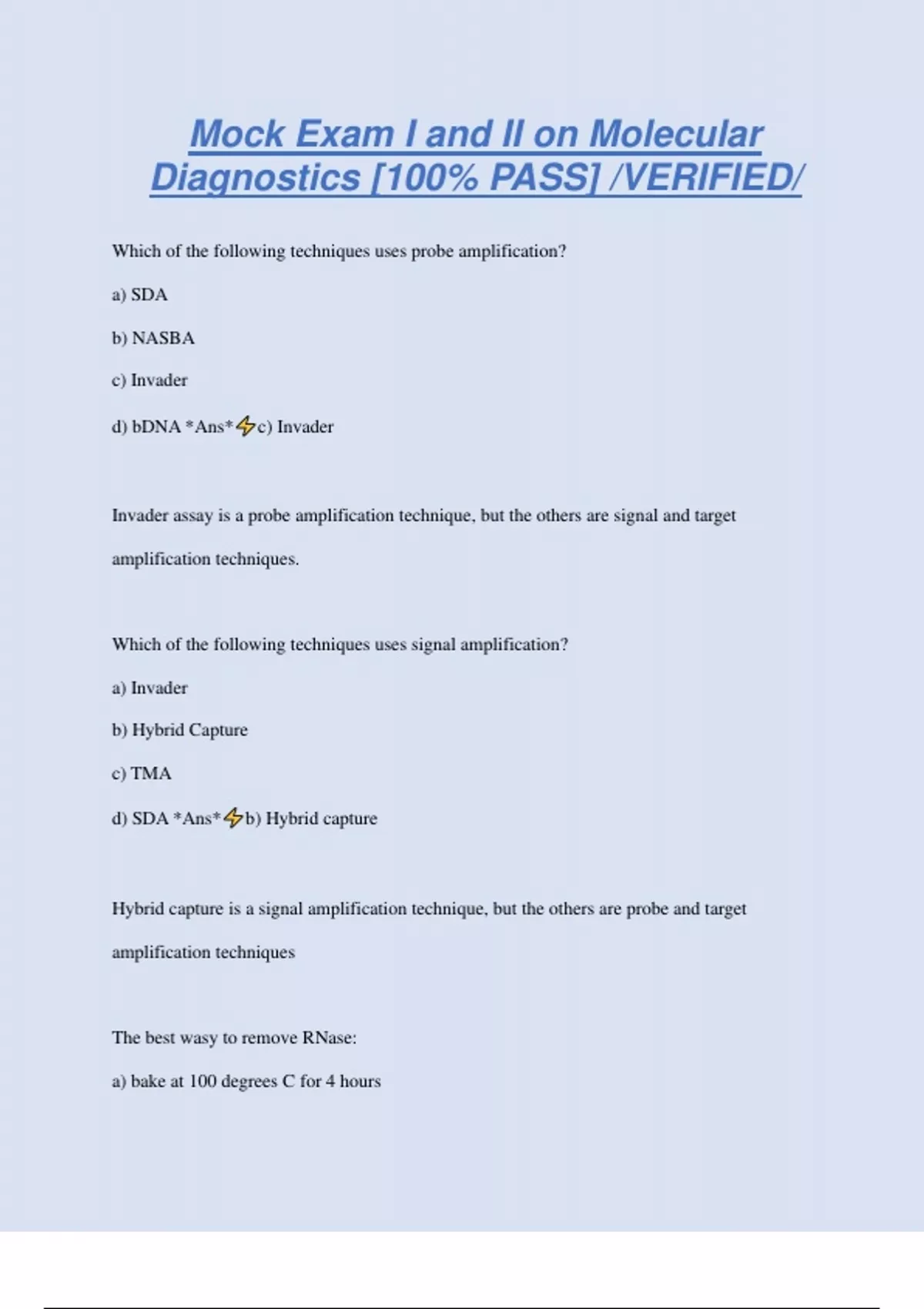 Mock Exam I and II on Molecular Diagnostics [100% PASS] /VERIFIED/ Which of the following techniques uses probe amplification? a) SDA b) NASBA c) Invader d) bDNA *Ans* c) Invader Invader assay is a probe amplification technique, but the others are signal and target amplification techniques. Which of the following techniques uses signal amplification? a) Invader b) Hybrid Capture c) TMA d) SDA *Ans* b) Hybrid capture Hybrid capture is a signal amplification technique, but the others are probe and target amplification techniques The best wasy to remove RNase: a) bake at 100 degrees C for 4 hours b) bake at 250 degrees C for 4 hours c) 0.01% DEPC at 37 degrees C for 1 hour d) autoclave for 30 minutes *Ans* b) bake at 250 degrees C for 4 hours Baking glassware or tubes at 250 degrees C for 4 hours is the best way to remove RNase Once DNA is primed and synthesized, ______ , an enzyme that hydrolyzes RNA from a complementary DNA strand, removes the primer RNA from the short RNA-DNA hybrid, and the resulting gap is filled by another DNA polymerase, pol I. a) DNase B b) RNase H c) RNase A d) DNase H *Ans* c) RNase H RNase H is an enzyme that hydrolyzes RNA from complementary DNA strand and removes the primer RNA from the short RNA-DNA hybrid Which of the following is the correct formula for specificity? a) number of TP/number of TP + number of FN b) number of TP/ number of TP - number of FN c) number of TN / number of TN - number of FP d) number of TN / number of TN + number of FP *Ans* d) number of TN/ number of TN + number of FP Which of the following RNA polymerases will synthesize snRNA