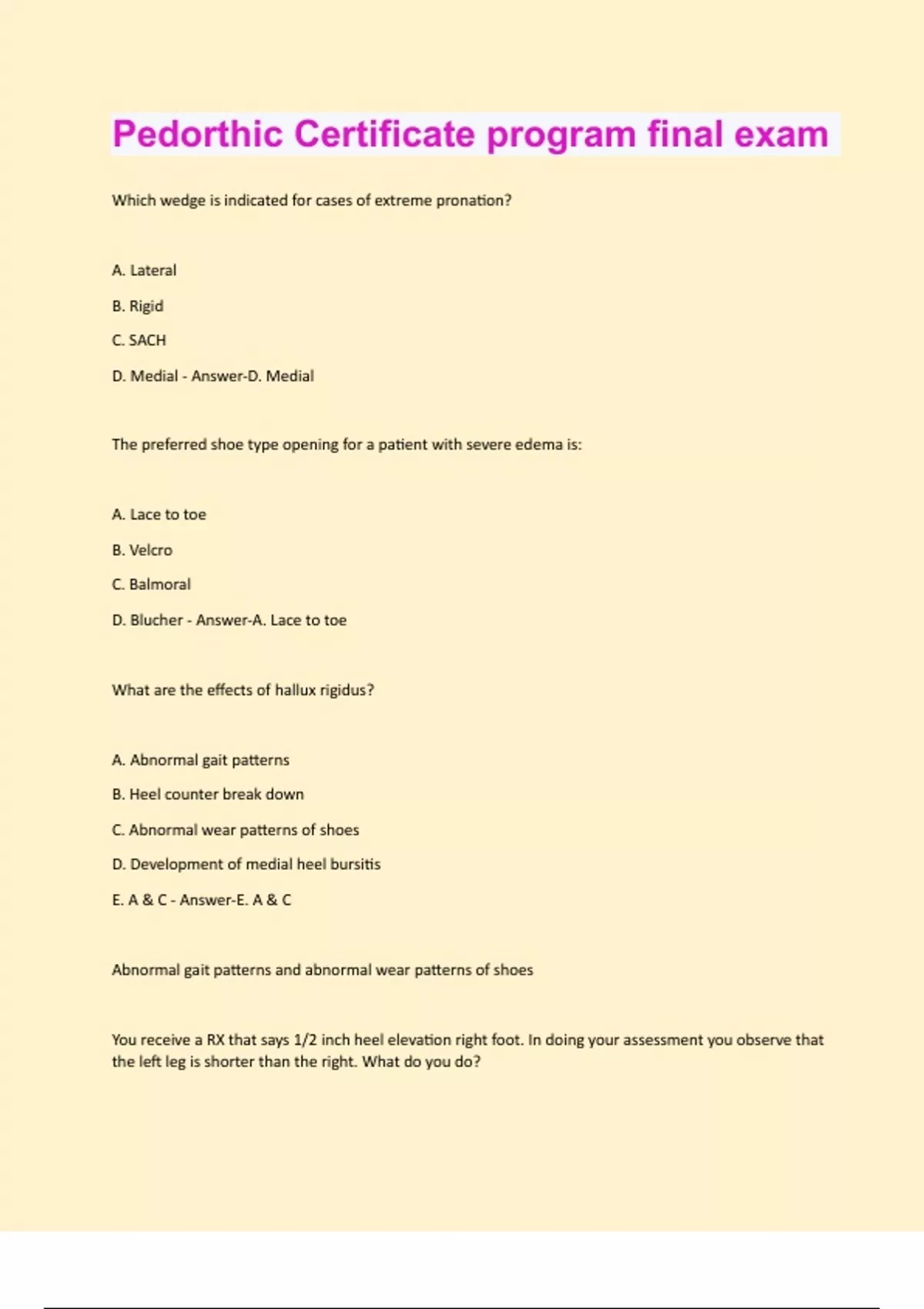 Which wedge is indicated for cases of extreme pronation? A. Lateral B. Rigid C. SACH D. Medial - Answer-D. Medial The preferred shoe type opening for a patient with severe edema is: A. Lace to toe B. Velcro C. Balmoral D. Blucher - Answer-A. Lace to toe What are the effects of hallux rigidus? A. Abnormal gait patterns B. Heel counter break down C. Abnormal wear patterns of shoes D. Development of medial heel bursitis E. A & C - Answer-E. A & C Abnormal gait patterns and abnormal wear patterns of shoes You receive a RX that says 1/2 inch heel elevation right foot. In doing your assessment you observe that the left leg is shorter than the right. What do you do?A. Fill the Rx as written B. Elevate the left shoe C. Send the patient to an orthopedic surgeon for further evaluation D. Call the prescriber to discuss your findings - Answer-D. Call the prescriber to discuss your findings Patient presents with plantar fasciitis. Evaluating their history, you are likely to see the condition in an individual with: A. Increased dorsiflexion of the foot B. Increased flatfoot C. Increased tibia varus D. Increased hammer toe deformity - Answer-B. Increased Flatfoot A patient presents with a diagnosis of charcot arthropathy which is: A. Neuropathy B. Arthritis C. Sciatica D. Hemiplegia - Answer-A. Neuropathy Insertional Achilles tendonitis is located: A. Inferior to the calcaneus B. Superior to the calcaneus C. Distal to the calcaneus D. Anterior to the calcaneus - Answer-B. Superior to the calcaneus Supination is:A. Adduction/plantar flexion/inversion B. Adduction/plantar flexion/eversion C. Adduction/dorsiflexion/inversion D.Abduction/dorsiflexion/inversion - Answer-A. Adduction/plantar flexion/inversion