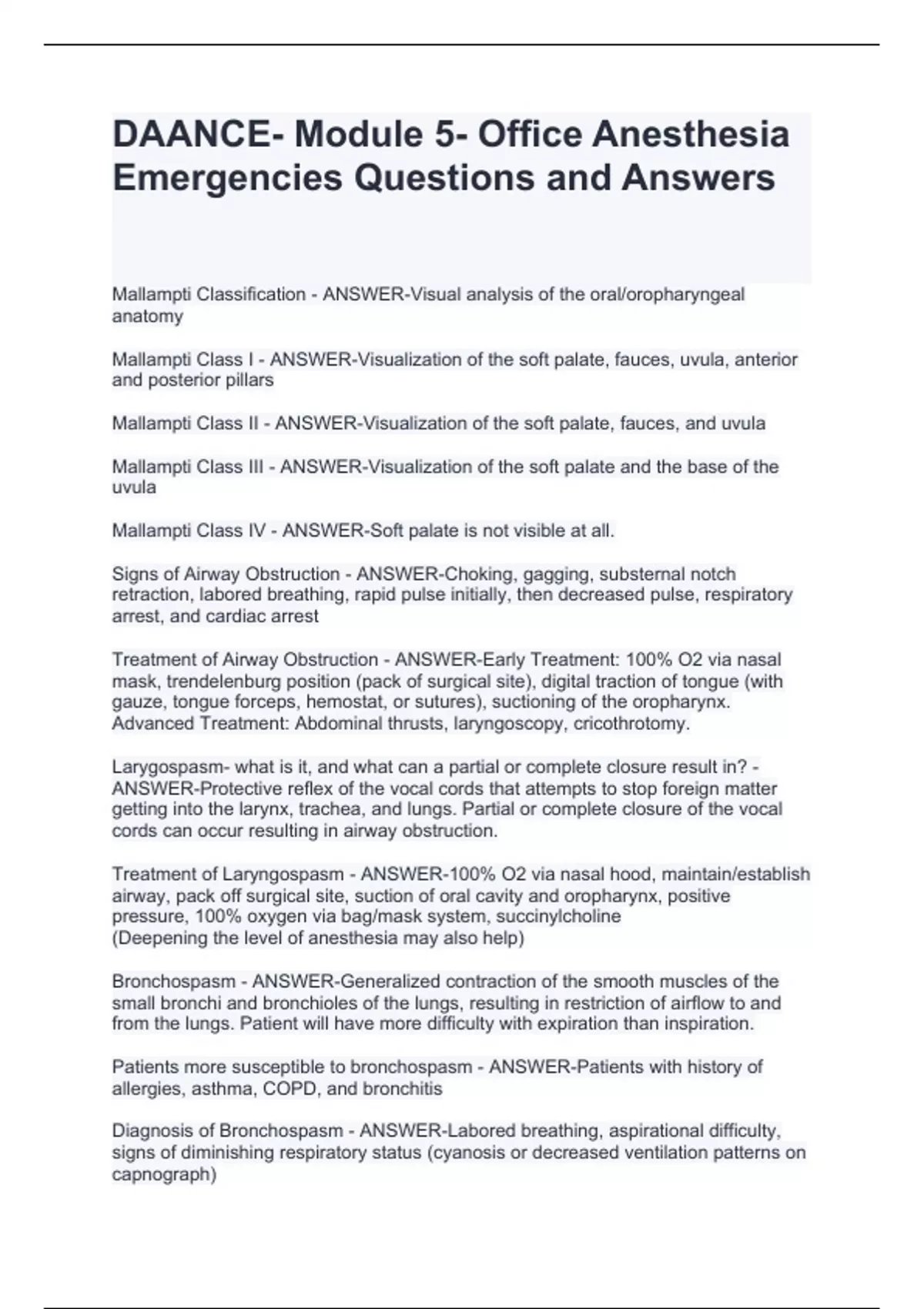 Mallampti Class I - ANSWER-Visualization of the soft palate, fauces, uvula, anterior and posterior pillars Mallampti Class II - ANSWER-Visualization of the soft palate, fauces, and uvula Mallampti Class III - ANSWER-Visualization of the soft palate and the base of the uvula Mallampti Class IV - ANSWER-Soft palate is not visible at all. Signs of Airway Obstruction - ANSWER-Choking, gagging, substernal notch retraction, labored breathing, rapid pulse initially, then decreased pulse, respiratory arrest, and cardiac arrest Treatment of Airway Obstruction - ANSWER-Early Treatment: 100% O2 via nasal mask, trendelenburg position (pack of surgical site), digital traction of tongue (with gauze, tongue forceps, hemostat, or sutures), suctioning of the oropharynx. Advanced Treatment: Abdominal thrusts, laryngoscopy, cricothrotomy. Larygospasm- what is it, and what can a partial or complete closure result in? - ANSWER-Protective reflex of the vocal cords that attempts to stop foreign matter getting into the larynx, trachea, and lungs. Partial or complete closure of the vocal cords can occur resulting in airway obstruction. Treatment of Laryngospasm - ANSWER-100% O2 via nasal hood, maintain/establish airway, pack off surgical site, suction of oral cavity and oropharynx, positive pressure, 100% oxygen via bag/mask system, succinylcholine (Deepening the level of anesthesia may also help) Bronchospasm - ANSWER-Generalized contraction of the smooth muscles of the small bronchi and bronchioles of the lungs, resulting in restriction of airflow to and from the lungs. Patient will have more difficulty with expiration than inspiration. Patients more susceptible to bronchospasm - ANSWER-Patients with history of allergies, asthma, COPD, and bronchitis Diagnosis of Bronchospasm - ANSWER-Labored breathing, aspirational difficulty, signs of diminishing respiratory status (cyanosis or decreased ventilation patterns on capnograph)