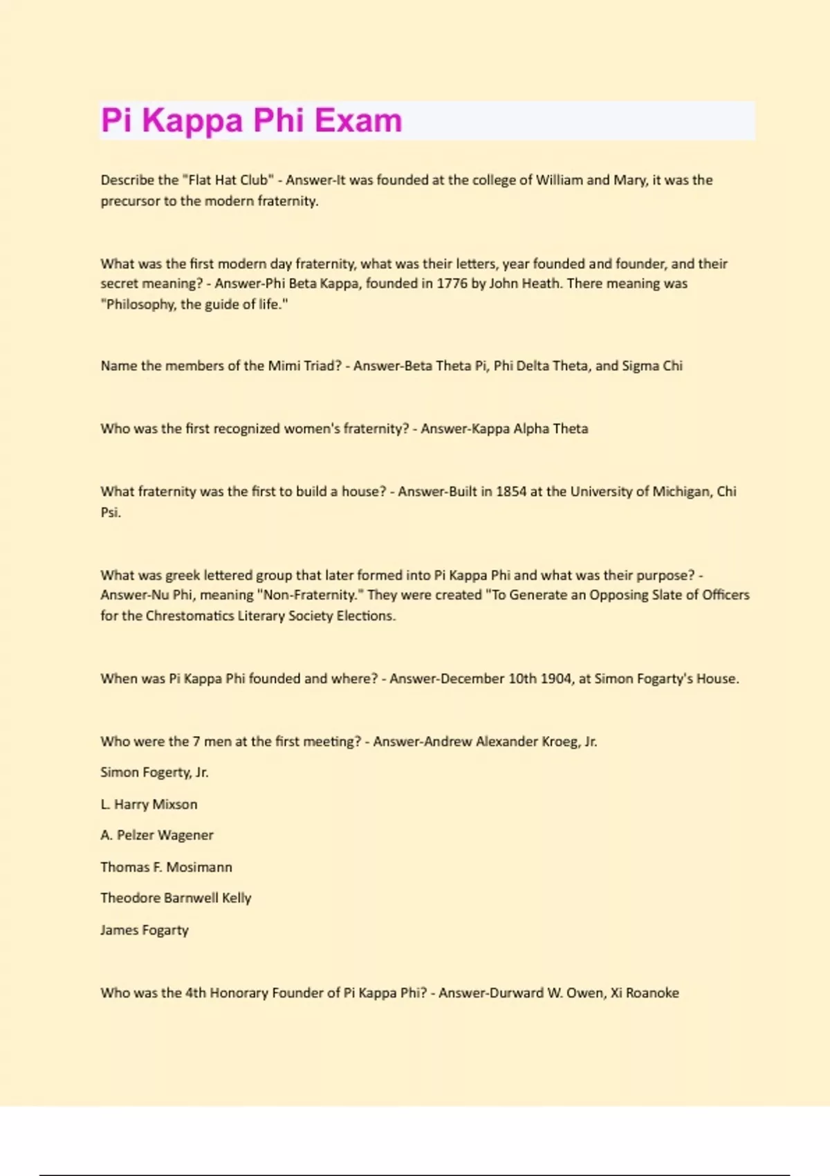 Describe the "Flat Hat Club" - Answer-It was founded at the college of William and Mary, it was the precursor to the modern fraternity. What was the first modern day fraternity, what was their letters, year founded and founder, and their secret meaning? - Answer-Phi Beta Kappa, founded in 1776 by John Heath. There meaning was "Philosophy, the guide of life." Name the members of the Mimi Triad? - Answer-Beta Theta Pi, Phi Delta Theta, and Sigma Chi Who was the first recognized women's fraternity? - Answer-Kappa Alpha Theta What fraternity was the first to build a house? - Answer-Built in 1854 at the University of Michigan, Chi Psi. What was greek lettered group that later formed into Pi Kappa Phi and what was their purpose? - Answer-Nu Phi, meaning "Non-Fraternity." They were created "To Generate an Opposing Slate of Officers for the Chrestomatics Literary Society Elections. When was Pi Kappa Phi founded and where? - Answer-December 10th 1904, at Simon Fogarty's House. Who were the 7 men at the first meeting? - Answer-Andrew Alexander Kroeg, Jr. Simon Fogerty, Jr. L. Harry Mixson A. Pelzer Wagener Thomas F. Mosimann Theodore Barnwell Kelly James Fogarty Who was the 4th Honorary Founder of Pi Kappa Phi? - Answer-Durward W. Owen, Xi RoanokeWhat is the motto of Pi Kappa Phi in greek and english? - Answer-OΥΔΕΝ ΔΙΑΣΠΑΣΕΙ ΗΜΑΣ, Nothing shall ever tear us asunder. What was the original motto of Pi Kappa Phi in latin and its translation? - Answer-"Nil Sebar Abit, Nothing Shall Separate Us". Name the 4 separate entities of Pi Kappa Phi? - Answer-The Fraternity PKP Properties The Foundation The Ability Experience Who is the CEO of Pi Kappa Phi? - Answer-Mark E. Timmes, Alpha Epsilon (Florida). Who is the National President? - Answer-Tracy D. Maddux, Zeta Theta (Texas-Austin). Who is the National Vice President? - Answer-Thomas B. Sullivan, Delta Omega (Texas A&M). Who is the National Treasure? - Answer-Jeremy D. Galvin, Alpha Omicron (Iowa State). Who is the National Secretary? - Answer-Timothy S. Hebson, Alpha Eta (Samford). Who is the National Historian? - Answer-Eric Almquist, Alpha Omicron (Iowa State). Who is the National Chaplin? - Answer-William Sigmon, Alpha Sigma (U of Tennessee). Who is the National Chancellor? - Answer-James Smith, Alpha Eta (Samford). Who is the student representative? - Answer-Andrew Carnes, Theta Sigma (Cal. State, long Beach)What is the MR. Pi Kappa Phi award, what is it, and who was the first to be named? - Answer-It recognizes superior lifetime achievement of a Pi Kappa Phi, It is the Highest Honor bestowed. The fist man was Leo Pou, Omicron (Alabama) in 1965. What is the Supreme Chapter of Pi Kappa Phi? - Answer-It is a Legislative Meeting held every 2 years. What is Pi Kapp College for Emerging Leaders? - Answer-It is the Educational Leadership Training Conferences, held every summer. What unique program is only offered at Pi Kapp college? - Answer-Certified Ritualist Program. What is Pi Kappa College for Chapter Officers (Mid-Year Leadership Conference) - Answer-It is an Officer Training Conference, held every January. Pi Kappa Phi has a volunteer structure that includes Regional Governor, Chapter Advisor and Board of Alumni Advisors. What is Ours? - Answer-Regional Governor- Vacant Chapter Advisor- Steven Peterson Board of Alumni Advisors- Vacant If you were organizing a social event, what guidelines must you follow if you abide by FIPG, Name 5. - Answer-Follow all laws, no purchase of alcohol with chapter funds,No bulk quantity or common source or Kegs, keep guest lists no open party's, no sale or distribution to minors, and no illegal drugs or controlled substances. Where is the National Office of Pi Kappa Phi? - Answer-Charlotte, NC. List the 5 areas of the Risk Management Policy of FIPG. - Answer-Hazing Education Fire, Health and Safety Alcohol and Drugs Sexual Abuse and HarassmentWhat was the name of the artist and architect that provided Pi Kappa Phi with the framework to develop the framework of The Abilities Experience in 1977? - Answer-Thomas Sayre, Kappa (University of North Carolina- Chapel Hill) What are the areas of service that characterize a balanced Abilities Experience? - Answer-Fundraising, Volunteerism, Awareness. What are the 4 pillars (Core Values) of The Abilities Experience? - Answer-Abilities, Teamwork, Empathy, Integrity. Name and briefly describe the 2 cycling events and one national building projects of the Abilities Experience. - Answer-Journey of Hope- Over 100 Pi Kapps from accost the country ride from San Francisco, CA to Washington, D.C. Gear Up Florida- 35 Pi Kapps ride accost the state of Florida. Build America- 30 Pi Kapps travel to summer camps for eight weeks. What are Push Camp and Give-a-Push weekends? - Answer-National service projects that involve the actual construction of accessible structures for people with disabilities. What is the first line of the Student Creed? - Answer-I believe that the ideal chapter is made up of men