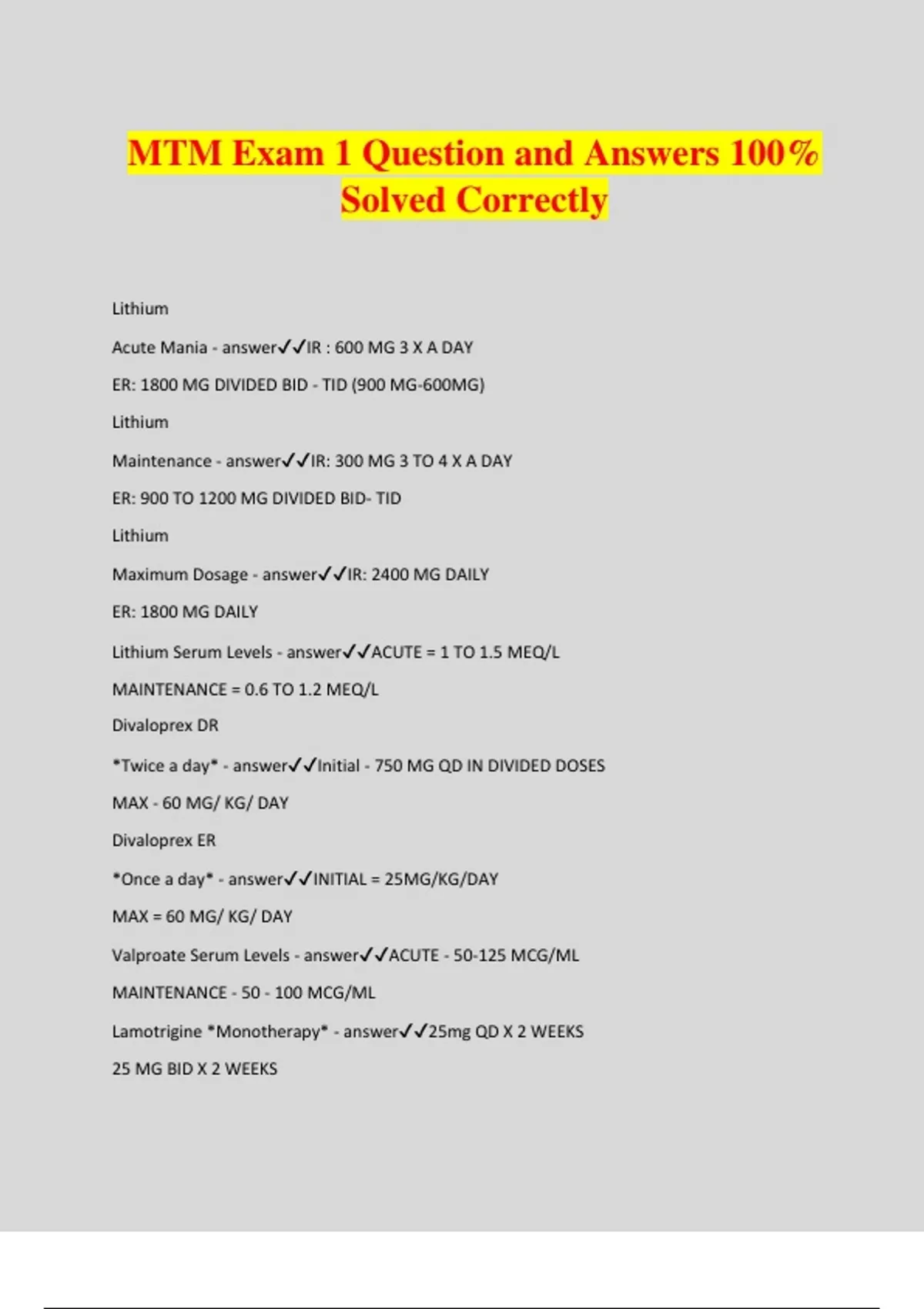 MTM Exam 1 Question and Answers 100% Solved Correctly Lithium Acute Mania - answerIR : 600 MG 3 X A DAY ER: 1800 MG DIVIDED BID - TID (900 MG-600MG) Lithium Maintenance - answerIR: 300 MG 3 TO 4 X A DAY ER: 900 TO 1200 MG DIVIDED BID- TID Lithium Maximum Dosage - answerIR: 2400 MG DAILY ER: 1800 MG DAILY Lithium Serum Levels - answerACUTE = 1 TO 1.5 MEQ/L MAINTENANCE = 0.6 TO 1.2 MEQ/L Divaloprex DR *Twice a day* - answerInitial - 750 MG QD IN DIVIDED DOSES MAX - 60 MG/ KG/ DAY Divaloprex ER *Once a day* - answerINITIAL = 25MG/KG/DAY MAX = 60 MG/ KG/ DAY Valproate Serum Levels - answerACUTE - 50-125 MCG/ML MAINTENANCE - 50 - 100 MCG/ML Lamotrigine *Monotherapy* - answer25mg QD X 2 WEEKS 25 MG BID X 2 WEEKS INCREASE DOSE BY 25 TO 50 MG QWEEK UNTIL MAINTENANCE DOSE *200 MG BID* IS ACHIEVED Lamotrigine w. Valporic Acid - answer25mg *QoD* X 2 WEEKS 25 MG QD X 2 WEEKS INCREASE DOSE BY 25 MG QWEEK UNTIL MAINTENANCE DOSE *100 MG BID* IS ACHIEVED Lamotrigine w. Carbamazepine - answer50mg QD X 2 WEEKS 50 MG BID X 2 WEEKS INCREASE DOSE BY 100 MG QWEEK UNTIL MAINTENANCE DOSE *200 MG BID* IS ACHIEVED Carbamazepine Serum Levels - answer4 - 12 mcg/ML Mixed/Acute Mania - answerApriprazole (Abilify) Asenapine (Saphris) Cariprazine (Vraylar) Olanzapine (Zyprexa) Quetiapine (Seroquel) Risperidone (Risperdal, Risperdal Consta) Ziprasidone (Geodon) All except Latuda and Symbyax Depressive - answerLurasidone (Latuda) Olanzapine/Fluoxetine (Symbyax) Quetiapine (Seroquel) Maintenance Therapy - answerApriprazole (Abilify) Asenapine (Saphris) Olanzapine (Zyprexa) Quetiapine (Seroquel) Risperidone (Risperdal, Risperdal Consta) Ziprasidone (Geodon) All except Vraylar, Latuda, Symbyax Abilify - answerAriprazole Mixed/Acute Mania: 10-15 mg QD; max 30mg QD (+/- lithium or depakote) Maintenance: 15mg QD; max 30 mg QD (+ lithium or depakote) LAI: 300-400mg IM QMonth Saphris - answerAsenapine Mixed/Acute Mania: 5-10 mg BID; max 10 mg BID (+/- lithium or depakote) Maintenance: 5-10 mg BID; max 10 mg BID Cariprazine (Vraylar) - answerMixed Acute Mania: 1.5 mg qd for 1 day, then 3 mg QD; max 6 mg QD Lurasidone (Latuda) - answerDepressive: 20 mg QD; max 120 mg QD (+/- lithium or depakote) Zyprexa - answerOlanzapine Mixed/Acute Mania: 5-20 mg QD; max 20 mg QD (+/- lithium or depakote) Maintenance: 5-20 mg QD; max 20 mg QD Olanzapine/Fluoxetine (Symbyax) - answerDepressive: 6-12 mg QD olanzapine/ 20-50mg fluoxetine Safety of doses > 18 mg olanzapine/ 75 mg fluoxetine not established Seroquel - answerQuetiapine Mixed/Acute Mania: IR: 200-400 mg BID ER: 400-800 mg HS Max 800 mg QD (+/- lithium or valproate) Depressive: IR/ER: Titrate to 300 mg HS; max 300 mg QD Maintenance: IR: 200-400 mg BID ER: 400-800 mg HS Max 800 mg QD (+ lithium or valproate) Risperdal, Risperdal Consta - answerRisperidone Mixed/Acute Mania: 2-3 mg QD; max 6 mg QD (+/- lithium or valproate) Maintenance: 2-3 mg QD; max 6 mg QD LAI: 37.5-50 mg IM Q2weeks; max 50 mg IM Q2weeks (+/- lithium or valproate)