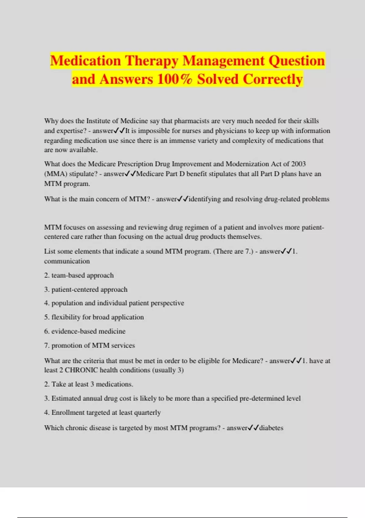 Medication Therapy Management Question and Answers 100% Solved Correctly Why does the Institute of Medicine say that pharmacists are very much needed for their skills and expertise? - answerIt is impossible for nurses and physicians to keep up with information regarding medication use since there is an immense variety and complexity of medications that are now available. What does the Medicare Prescription Drug Improvement and Modernization Act of 2003 (MMA) stipulate? - answerMedicare Part D benefit stipulates that all Part D plans have an MTM program. What is the main concern of MTM? - answeridentifying and resolving drug-related problems MTM focuses on assessing and reviewing drug regimen of a patient and involves more patient- centered care rather than focusing on the actual drug products themselves. List some elements that indicate a sound MTM program. (There are 7.) - answer1. communication 2. team-based approach 3. patient-centered approach 4. population and individual patient perspective 5. flexibility for broad application 6. evidence-based medicine 7. promotion of MTM services What are the criteria that must be met in order to be eligible for Medicare? - answer1. have at least 2 CHRONIC health conditions (usually 3) 2. Take at least 3 medications. 3. Estimated annual drug cost is likely to be more than a specified pre-determined level 4. Enrollment targeted at least quarterly Which chronic disease is targeted by most MTM programs? - answerdiabetes
