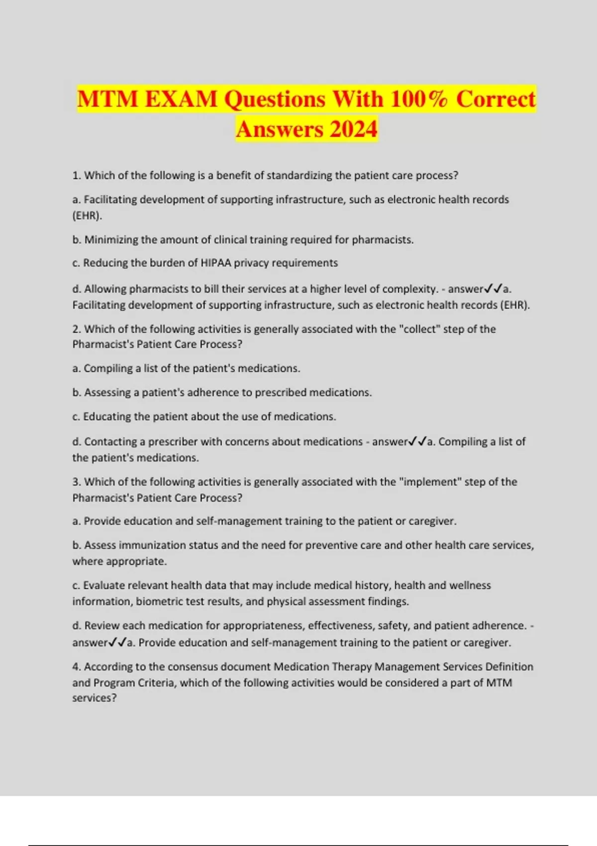 MTM EXAM Questions With 100% Correct Answers 2024 1. Which of the following is a benefit of standardizing the patient care process? a. Facilitating development of supporting infrastructure, such as electronic health records (EHR). b. Minimizing the amount of clinical training required for pharmacists. c. Reducing the burden of HIPAA privacy requirements d. Allowing pharmacists to bill their services at a higher level of complexity. - answera. Facilitating development of supporting infrastructure, such as electronic health records (EHR). 2. Which of the following activities is generally associated with the "collect" step of the Pharmacist's Patient Care Process? a. Compiling a list of the patient's medications. b. Assessing a patient's adherence to prescribed medications. c. Educating the patient about the use of medications. d. Contacting a prescriber with concerns about medications - answera. Compiling a list of the patient's medications. 3. Which of the following activities is generally associated with the "implement" step of the Pharmacist's Patient Care Process? a. Provide education and self-management training to the patient or caregiver. b. Assess immunization status and the need for preventive care and other health care services, where appropriate. c. Evaluate relevant health data that may include medical history, health and wellness information, biometric test results, and physical assessment findings. d. Review each medication for appropriateness, effectiveness, safety, and patient adherence. - answera. Provide education and self-management training to the patient or caregiver. 4. According to the consensus document Medication Therapy Management Services Definition and Program Criteria, which of the following activities would be considered a part of MTM services? a. Answering a patient's question when he or she picks up a prescription. b. Performing chart reviews for a long-term care facility. c. Performing a comprehensive medication review for a patient to identify, resolve, and prevent medication-related problems. d. Providing recommendations to a formulary committee. - answerc. Performing a comprehensive medication review for a patient to identify, resolve, and prevent medication- related problems. 5. Which of the following is an important distinction between MTM services and disease management programs? a. Diet and exercise are never addressed during MTM services. b. Disease management programs focus on a specific disease rather than the patient's overall health concerns. c. Disease management programs generally are not documented. d. Only MTM services include clinical assessment such as taking a patient's blood pressure. - answerb. Disease management programs focus on a specific disease rather than the patient's overall health concerns 6. Which of the following statements about the core elements model framework for MTM services is true? a. The model applies only to community pharmacy practice. b. The model can be used only for MTM services that are delivered to patients with Medicare Part D coverage. c. The model defines a minimum level of service required for services to be considered MTM. d. The model is designed to improve the efficiency of MTM services while helping to address medication-related problems. - answerd. The model is designed to improve the efficiency of MTM services while helping to address medication-related problems. 7. Which of the following statements about a personal medication record (PMR) is true? a. The PMR never needs to be updated. b. The patient should keep the PMR private and not share it with other health care providers. c. The PMR should include only prescription medications. d. The PMR is designed as a tool to help patients self-manage their medications. - answerd. The PMR is designed as a tool to help patients self-manage their medications.