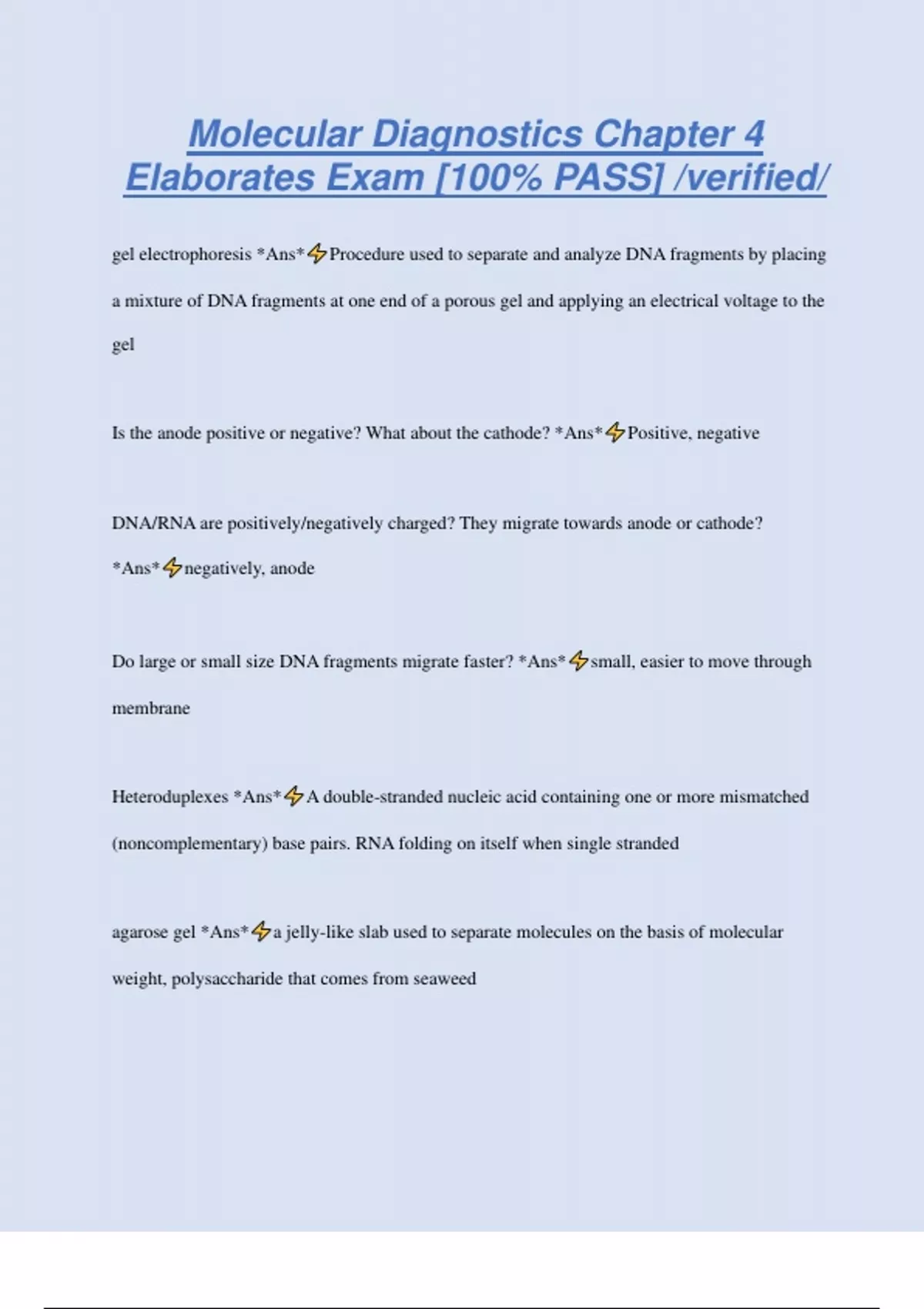 Molecular Diagnostics Chapter 4 Elaborates Exam [100% PASS] /verified/ gel electrophoresis *Ans* Procedure used to separate and analyze DNA fragments by placing a mixture of DNA fragments at one end of a porous gel and applying an electrical voltage to the gel Is the anode positive or negative? What about the cathode? *Ans* Positive, negative DNA/RNA are positively/negatively charged? They migrate towards anode or cathode? *Ans* negatively, anode Do large or small size DNA fragments migrate faster? *Ans* small, easier to move through membrane Heteroduplexes *Ans* A double-stranded nucleic acid containing one or more mismatched (noncomplementary) base pairs. RNA folding on itself when single stranded agarose gel *Ans* a jelly-like slab used to separate molecules on the basis of molecular weight, polysaccharide that comes from seaweed concentration of agarose in a gel determines the size of spaces in the gel. 3% agarose resolution is best for _______bp of DNA. 0.6% is best ________bp of DNA. *Ans* 50-100 bp and 1000, 20,000 Are low concentration agarose gels easily broken? *Ans* yes Electroendosmosis *Ans* This electrophoresis error is caused by cations in the buffer moving in the opposite direction which slows/distorts migration of samples Pulse field gel electrophoresis (PFGE) *Ans* used to separate especially long strands of DNA by length in order to tell differences among samples. Does so by alternating current in different dimensions during migration of sample. Requires long separation times and temperature control. 50,000-250,000bp FIGE *Ans* field-inversion electrophoresis, samples move forward and backward due to the changing current/pulse field polyacrylamide gel *Ans* -porous matrix mixture used in electrophoresis typically for smaller fragments -single bp resolution so can be used for sequencing and mutation analysis -synthetic can be manipulated to have exact same conditions or necessary condition