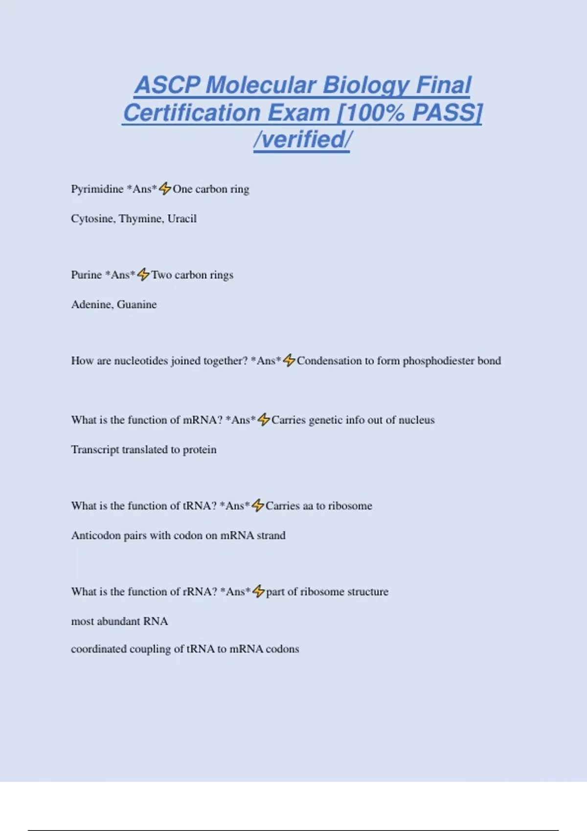 ASCP Molecular Biology Final Certification Exam [100% PASS] /verified/ Pyrimidine *Ans* One carbon ring Cytosine, Thymine, Uracil Purine *Ans* Two carbon rings Adenine, Guanine How are nucleotides joined together? *Ans* Condensation to form phosphodiester bond What is the function of mRNA? *Ans* Carries genetic info out of nucleus Transcript translated to protein What is the function of tRNA? *Ans* Carries aa to ribosome Anticodon pairs with codon on mRNA strand What is the function of rRNA? *Ans* part of ribosome structure most abundant RNA coordinated coupling of tRNA to mRNA codons Feedback inhibition *Ans* Product of pathway is noncompetitive inhibitor Binds to allosteric site to slow down rxn b/c too much product Exonucleases *Ans* Degrades nucleic acids by removing one terminal nt at a time Cleaves phosphodiester bond at end of chain 5' --> 3' and 3' --> 5' Endonucleases (Prok) *Ans* Restriction enzymes Cleaves phoshpodiester bonds w/i poly-nt chain Recognition site is palindromic sequence Types I-V ORI sites *Ans* nt sequence where replication is initiated Topoisomerase I *Ans* Induces ss breaks Remove DNA supercoils during TXN and DNA replication; for strand breakage during recombination; for chr condensation; and to disentangle intertwined DNA during mitosis topoisomerase II *Ans* cuts both strands of one DNA double helix, passes another unbroken DNA helix through it, and then reanneals the cut strands