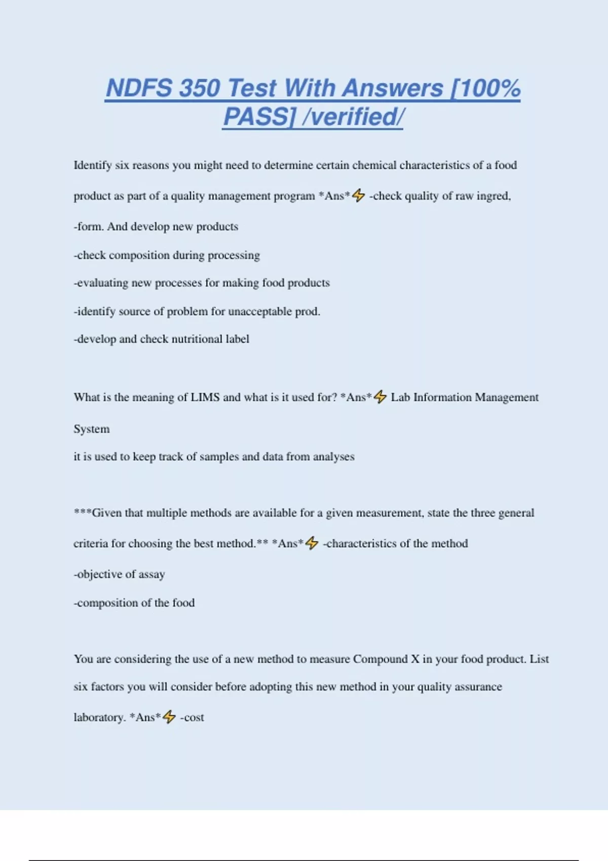 NDFS 350 Test With Answers [100% PASS] /verified/ Identify six reasons you might need to determine certain chemical characteristics of a food product as part of a quality management program *Ans* -check quality of raw ingred, -form. And develop new products -check composition during processing -evaluating new processes for making food products -identify source of problem for unacceptable prod. -develop and check nutritional label What is the meaning of LIMS and what is it used for? *Ans* Lab Information Management System it is used to keep track of samples and data from analyses ***Given that multiple methods are available for a given measurement, state the three general criteria for choosing the best method.** *Ans* -characteristics of the method -objective of assay -composition of the food You are considering the use of a new method to measure Compound X in your food product. List six factors you will consider before adopting this new method in your quality assurance laboratory. *Ans* -cost -time required -accuracy -precision -equiptment req -sample size required -reagents required -safety ****The choice of method is influenced by the objective of the measurement, e.g., nutrition labeling vs. process control (quality assurance). Contrast primary (official) and secondary (field or rapid) methods of analysis, regarding 1) time required, 2) accuracy, and 3) use. Would nutrition labeling require an official or a rapid method?** *Ans* primary takes more time, but is more accurate. primary is used for nutrition labeling, while secondary is used for QA. Usually the food matrix presents the greatest challenge in food analysis. Give one example. *Ans* different methods should be used for different types of foods. for example, if you use a method for something dry, like flour, to measure moisture content of fat, the fat could splatter out of the container, which would not make the moisture content accurate Explain what is meant by the term "standard reference materials" or "check sample." *Ans* - standard: comes from US pharmacopedia, and you are able to know it exactly -check: AOCS or AACC (take average from multiple different labs)