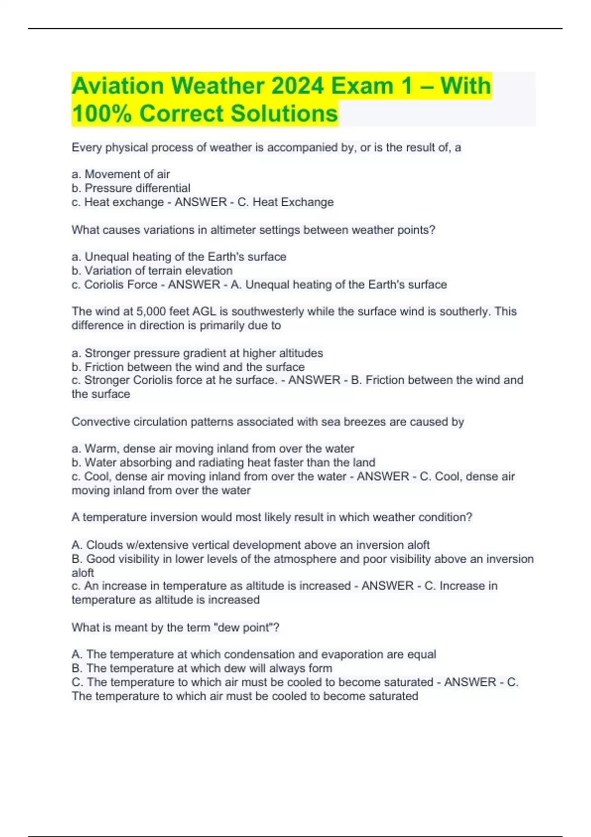 Aviation Weather 2024 Exam 1 – With 100% Correct SolutionsAviation Weather 2024 Exam 1 – With 100% Correct SolutionsAviation Weather 2024 Exam 1 – With 100% Correct SolutionsAviation Weather 2024 Exam 1 – With 100% Correct Solutions