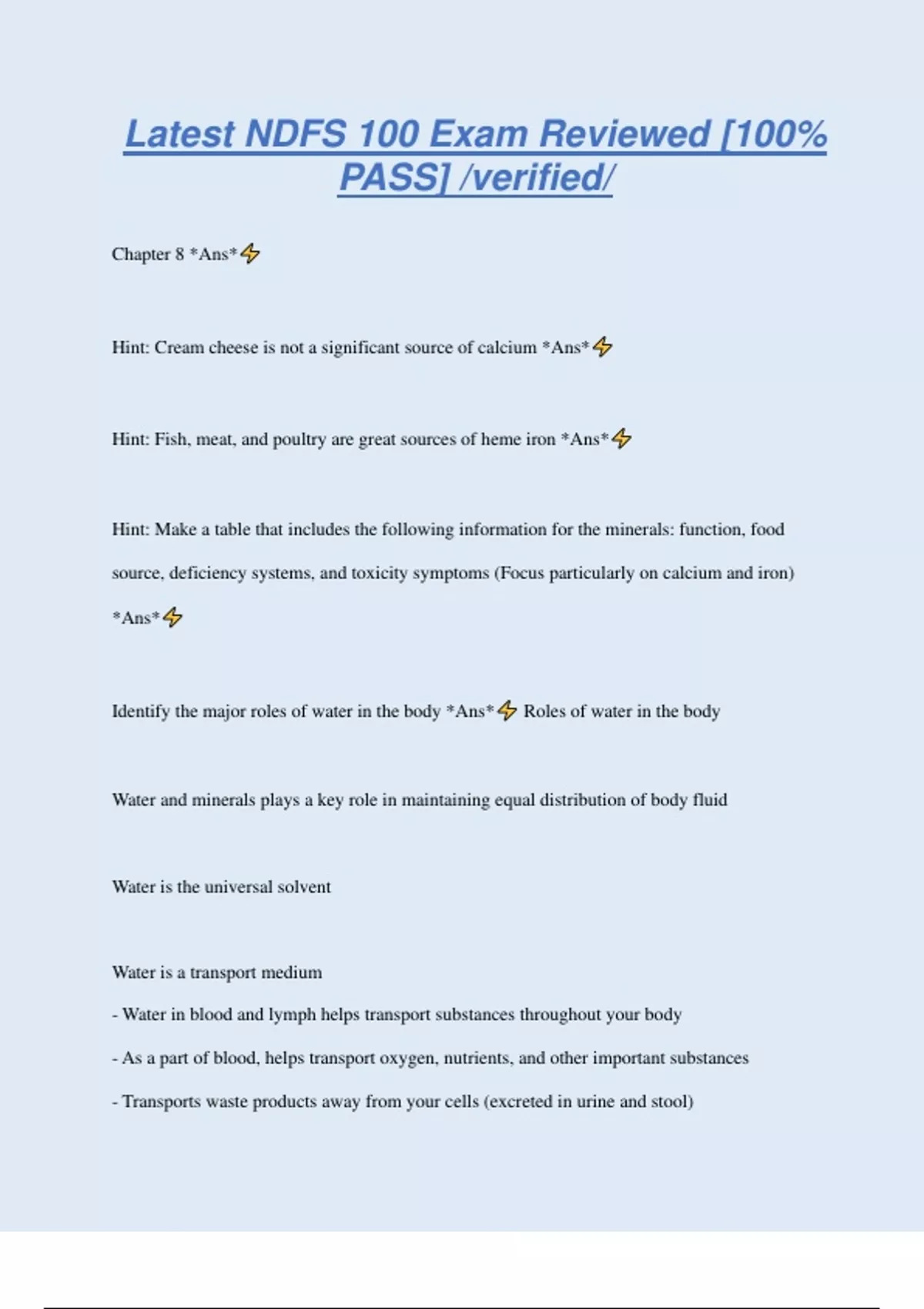 Latest NDFS 100 Exam Reviewed [100% PASS] /verified/ Chapter 8 *Ans* Hint: Cream cheese is not a significant source of calcium *Ans* Hint: Fish, meat, and poultry are great sources of heme iron *Ans* Hint: Make a table that includes the following information for the minerals: function, food source, deficiency systems, and toxicity symptoms (Focus particularly on calcium and iron) *Ans* Identify the major roles of water in the body *Ans* Roles of water in the body Water and minerals plays a key role in maintaining equal distribution of body fluid Water is the universal solvent Water is a transport medium - Water in blood and lymph helps transport substances throughout your body - As a part of blood, helps transport oxygen, nutrients, and other important substances - Transports waste products away from your cells (excreted in urine and stool) - Lymph fluid is almost entirely water; water transports proteins back to blood stream; important in absorption of fats Water helps maintain body temp - Absorbs, carries, and releases heat to keep from overheating Water is a lubricant and a protective cushion - Lubricant for joints - Water in tears lubricates eyes - Part of saliva that moistens mouth - Part of mucus that lubricates your GI tract - Surrounds your organ Factors influencing the amount of water needed by the body *Ans* Various environmental factors such as temperature, humidity, radiation, and atmospheric pressure affect mainly sweating and urinary water loss, while physical exercise affects, in addition, increased respiratory water loss from the increased expiratory volume and frequency of breathing. Sources of water *Ans* - Tap or bottled water - Milk - Juices - Food Tap vs. bottled water *Ans* Tap: - Sent to a treatment plant where dirt and debris are filtered, bacteria are killed, and contamin