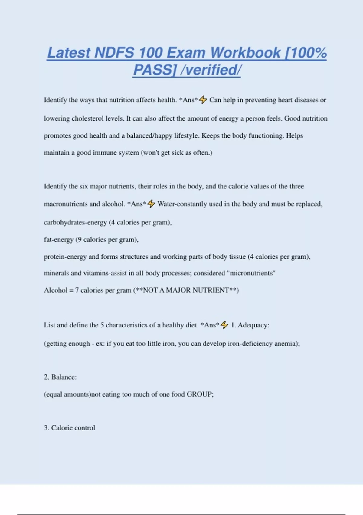 Latest NDFS 100 Exam Workbook [100% PASS] /verified/ Identify the ways that nutrition affects health. *Ans* Can help in preventing heart diseases or lowering cholesterol levels. It can also affect the amount of energy a person feels. Good nutrition promotes good health and a balanced/happy lifestyle. Keeps the body functioning. Helps maintain a good immune system (won't get sick as often.) Identify the six major nutrients, their roles in the body, and the calorie values of the three macronutrients and alcohol. *Ans* Water-constantly used in the body and must be replaced, carbohydrates-energy (4 calories per gram), fat-energy (9 calories per gram), protein-energy and forms structures and working parts of body tissue (4 calories per gram), minerals and vitamins-assist in all body processes; considered "micronutrients" Alcohol = 7 calories per gram (**NOT A MAJOR NUTRIENT**) List and define the 5 characteristics of a healthy diet. *Ans* 1. Adequacy: (getting enough - ex: if you eat too little iron, you can develop iron-deficiency anemia); 2. Balance: (equal amounts)not eating too much of one food GROUP; 3. Calorie control (helps to maintain weight); 4. Moderation: (not too much of one specific kind of food - ex: don't pile up on the fats and sugars); 5. Variety: (different array - ex: don't eat the same meal day after day...can cause toxins or contaminants) ABCMV Use knowledge of the scientific method to find and recognize credible sources of information. *Ans* Scientific Method: 1. observation 2. hypothesis 3. experiment 4. results & interpret 5. supported v. not supported 6. theory v. new question Case study *Ans* look at one individual or a small group of people, can go into lots of analysis, be careful not to apply generalization Epidemiology Study *Ans* looking at an entire country's eating habits and correlations between diseases and eating from the people as a whole Intervention Study *Ans* altering a person's diet in order to see the results Experiment/Laboratory Study *Ans* altering specific variables in an experiment in order to produce concrete results that can prove causation, must have more than one study to prove