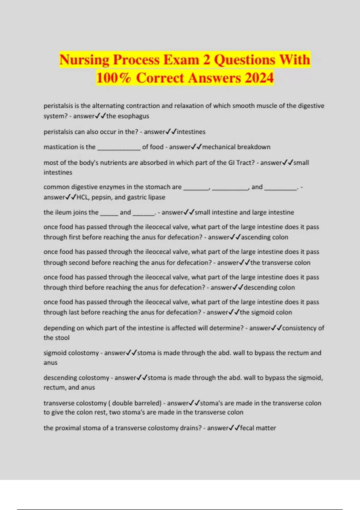 Nursing Process Exam 2 Questions With 100% Correct Answers 2024 peristalsis is the alternating contraction and relaxation of which smooth muscle of the digestive system? - answerthe esophagus peristalsis can also occur in the? - answerintestines mastication is the ____________ of food - answermechanical breakdown most of the body's nutrients are absorbed in which part of the GI Tract? - answersmall intestines common digestive enzymes in the stomach are _______, __________, and _________. - answerHCL, pepsin, and gastric lipase the ileum joins the _____ and ______. - answersmall intestine and large intestine once food has passed through the ileocecal valve, what part of the large intestine does it pass through first before reaching the anus for defecation? - answerascending colon once food has passed through the ileocecal valve, what part of the large intestine does it pass through second before reaching the anus for defecation? - answerthe transverse colon once food has passed through the ileocecal valve, what part of the large intestine does it pass through third before reaching the anus for defecation? - answerdescending colon once food has passed through the ileocecal valve, what part of the large intestine does it pass through last before reaching the anus for defecation? - answerthe sigmoid colon depending on which part of the intestine is affected will determine? - answerconsistency of the stool sigmoid colostomy - answerstoma is made through the abd. wall to bypass the rectum and anus descending colostomy - answerstoma is made through the abd. wall to bypass the sigmoid, rectum, and anus transverse colostomy ( double barreled) - answerstoma's are made in the transverse colon to give the colon rest, two stoma's are made in the transverse colon the proximal stoma of a transverse colostomy drains? - answerfecal matter