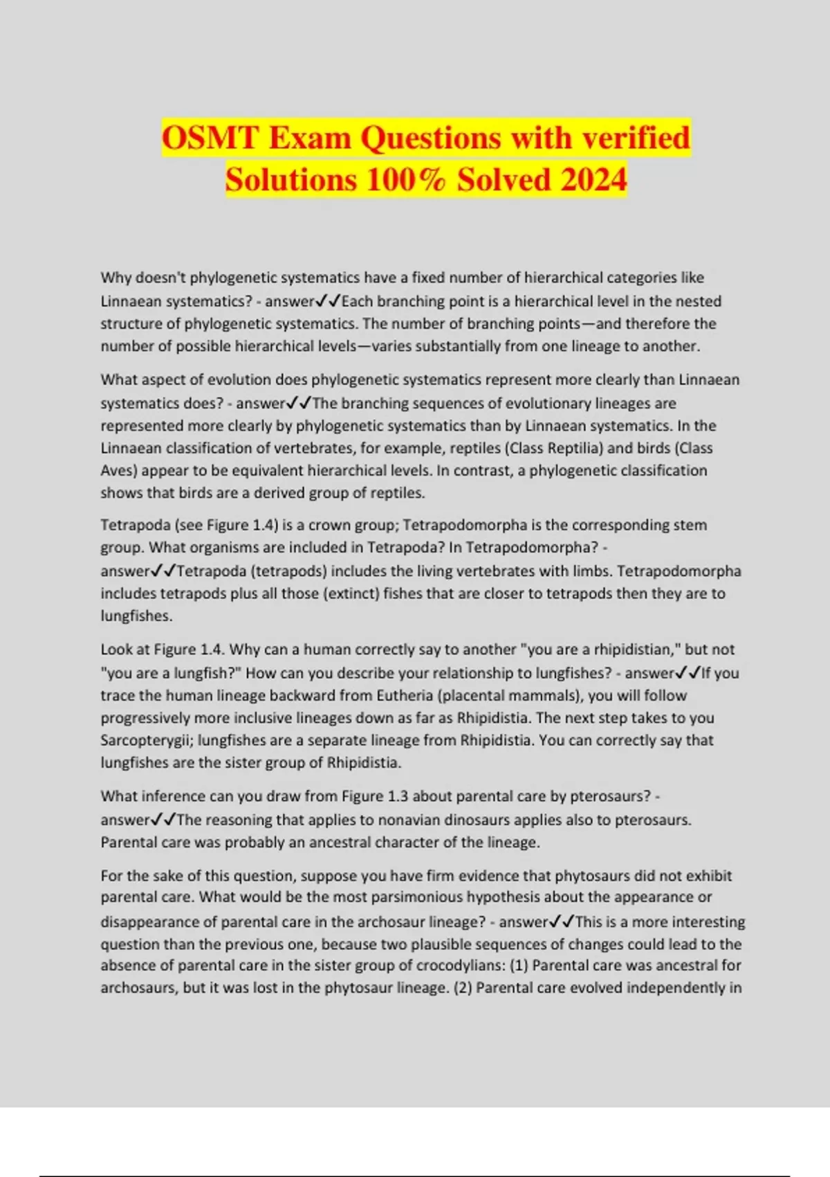 OSMT Exam Questions with verified Solutions 100% Solved 2024 Why doesn't phylogenetic systematics have a fixed number of hierarchical categories like Linnaean systematics? - answerEach branching point is a hierarchical level in the nested structure of phylogenetic systematics. The number of branching points—and therefore the number of possible hierarchical levels—varies substantially from one lineage to another. What aspect of evolution does phylogenetic systematics represent more clearly than Linnaean systematics does? - answerThe branching sequences of evolutionary lineages are represented more clearly by phylogenetic systematics than by Linnaean systematics. In the Linnaean classification of vertebrates, for example, reptiles (Class Reptilia) and birds (Class Aves) appear to be equivalent hierarchical levels. In contrast, a phylogenetic classification shows that birds are a derived group of reptiles. Tetrapoda (see Figure 1.4) is a crown group; Tetrapodomorpha is the corresponding stem group. What organisms are included in Tetrapoda? In Tetrapodomorpha? - answerTetrapoda (tetrapods) includes the living vertebrates with limbs. Tetrapodomorpha includes tetrapods plus all those (extinct) fishes that are closer to tetrapods then they are to lungfishes. Look at Figure 1.4. Why can a human correctly say to another "you are a rhipidistian," but not "you are a lungfish?" How can you describe your relationship to lungfishes? - answerIf you trace the human lineage backward from Eutheria (placental mammals), you will follow progressively more inclusive lineages down as far as Rhipidistia. The next step takes to you Sarcopterygii; lungfishes are a separate lineage from Rhipidistia. You can correctly say that lungfishes are the sister group of Rhipidistia. What inference can you draw from Figure 1.3 about parental care by pterosaurs? - answerThe reasoning that applies to nonavian dinosaurs applies also to pterosaurs. Parental care was probably an ancestral character of the lineage. For the sake of this question, suppose you have firm evidence that phytosaurs did not exhibit parental care. What would be the most parsimonious hypothesis about the appearance or disappearance of parental care in the archosaur lineage? - answerThis is a more interesting question than the previous one, because two plausible sequences of changes could lead to the absence of parental care in the sister group of crocodylians: (1) Parental care was ancestral for archosaurs, but it was lost in the phytosaur lineage. (2) Parental care evolved independently in the crocodylian lineage and in Dinosauria. Both hypotheses require two changes: (1) Parental care was gained in an ancestral archosaur and lost in phytosaurs. (2) Parental care was gained in crocodylians and again in pterosaurs + dinosaurs. The hypotheses are equally parsimonious. Suppose new molecular data showed that tunicates and vertebrates are sister taxa. What difference would this make to our assumptions about the form of the original chordate animal? What additional features might this animal have possessed? - answerThis would mean that the original chordate was a mobile animal throughout life, rather than sessile as an adult. With this scenario, amphioxus serves as a model for what the basic chordate plan might have been like. In addition, the earliest chordate would probably have had the features that are shared by amphioxus and vertebrates (e.g., segmental muscles through the entire trunk, not just the tail), and these would have been ancestral characters for tunicates that were secondarily lost in the sessile adult forms. Why would evidence of sense organs in the head of a fossil nonvertebrate chordate suggest a close relationship with vertebrates; that is, which critical vertebrate feature would have to be present? - answerVertebrate sense organs are formed from neural-crest tissue and epidermal placodes, both of which are unique vertebrate features. The presence of such structures in an adult chordate suggests the presence of these vertebrate embryological tissues, and hence a closer relationship to vertebrates than amphioxus or tunicates (which lack these tissues). Vertebrates have been described as "dual animals," consisting of both segmented and unsegmented portions. How is this duality reflected in their embryonic development and the structure of the nervous system? - answerDuring embryonic development, the mesoderm is divided into the segmented somite (making, among other things, the striated muscles that power locomotion) and the unsegmented lateral plate (making, among other things, the smooth muscles of the gut). The dual nervous system follows this embryological division: the somatic (voluntary nervous system) innervates the striated muscles, and the visceral (involuntary nervous system) innervates the smooth muscles. How could duplication of Hox genes lead to the structural complexity of vertebrates? - answerHox genes control expression of developmental genes in specific regions of the body, and duplication of a Hox gene is believed to allow the paralogs to diverge in function, changing the timing or rate of expression of structural genes, for example. Those changes could lead to differences in the adult phenotype of an organism. We think of the presence of ice caps at the poles as the "normal" condition for Earth, but in fact this situation is less common over geological history than are ice-free polar regions. How does continental movement relate to this? - answerIce will form at the poles only in a globally cool world, and it usually forms over a continental landmass. If the continents are distributed in more equatorial realms, Earth will be warmer and there will be no polar ice. Ocean currents