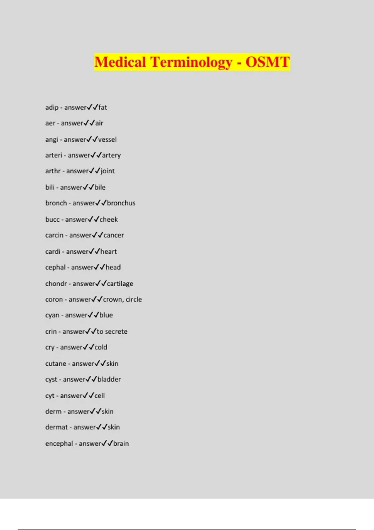 Medical Terminology - OSMT adip - answerfat aer - answerair angi - answervessel arteri - answerartery arthr - answerjoint bili - answerbile bronch - answerbronchus bucc - answercheek carcin - answercancer cardi - answerheart cephal - answerhead chondr - answercartilage coron - answercrown, circle cyan - answerblue crin - answerto secrete cry - answercold cutane - answerskin cyst - answerbladder cyt - answercell derm - answerskin dermat - answerskin encephal - answerbrain enter - answerintestines erythr - answerred esophag - answeresophagus estr - answerfemale fibrin - answerfiber gastr - answerstomach gluc - answersugar,glucose glyc - answersugar, glucose hem - answerblood hemat - answerblood hepat - answerliver hist - answertissue kerat - answerhard, cornea leuk - answerwhite lip - answerfat melan - answerblack morph - answerform my - answermuscle nat - answerbirth necr - answerdeath nephr - answerkidney neur - answernerve onc - answertumour oste - answerbone path - answerdisease
