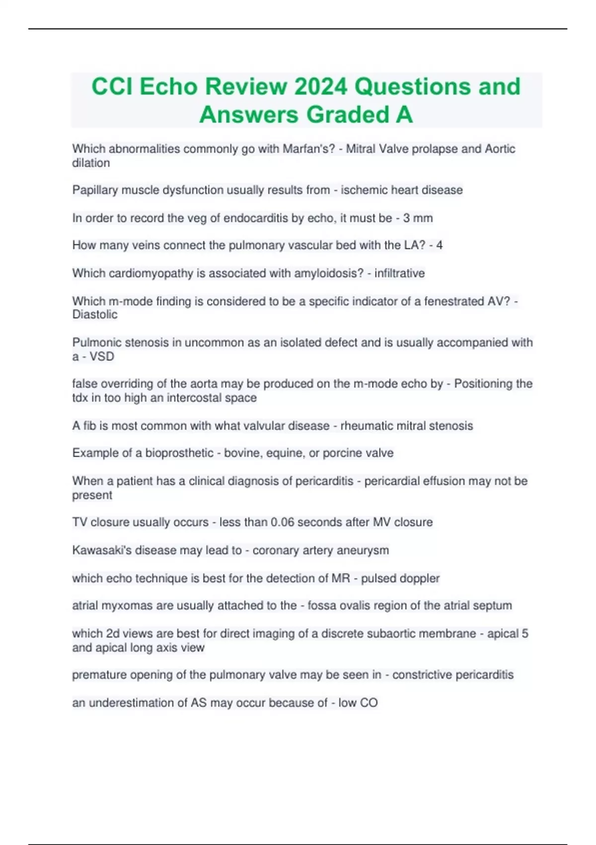 Which abnormalities commonly go with Marfan's? - Mitral Valve prolapse and Aortic dilation Papillary muscle dysfunction usually results from - ischemic heart disease In order to record the veg of endocarditis by echo, it must be - 3 mm How many veins connect the pulmonary vascular bed with the LA? - 4 Which cardiomyopathy is associated with amyloidosis? - infiltrative Which m-mode finding is considered to be a specific indicator of a fenestrated AV? - Diastolic Pulmonic stenosis in uncommon as an isolated defect and is usually accompanied with a - VSD false overriding of the aorta may be produced on the m-mode echo by - Positioning the tdx in too high an intercostal space A fib is most common with what valvular disease - rheumatic mitral stenosis Example of a bioprosthetic - bovine, equine, or porcine valve When a patient has a clinical diagnosis of pericarditis - pericardial effusion may not be present TV closure usually occurs - less than 0.06 seconds after MV closure Kawasaki's disease may lead to - coronary artery aneurysm which echo technique is best for the detection of MR - pulsed doppler atrial myxomas are usually attached to the - fossa ovalis region of the atrial septum which 2d views are best for direct imaging of a discrete subaortic membrane - apical 5 and apical long axis view premature opening of the pulmonary valve may be seen in - constrictive pericarditis an underestimation of AS may occur because of - low CO Estimation of MV area from doppler is calculated by the - pressure half-time What is the standard view for contrast study with an ASD? - apical 4 The doppler jet of MS obtained at the apex is sometimes confused with - Aortic Insufficiency For patients with AS and A fib, peak systolic aortic velocity will - be higher following long R-R intervals Aliasing on color flow doppler is shown by a - reversal in color Premature MV closure on mmode is a sign of high LV diastolic pressure in - aortic insuffiency Midsystolic clicks and or late systolic murmurs are most characteristic of - MV prolapse The two most frequently encountered congenital heart lesions in adults are - ASD and bicuspid AV On m-mose a flail MV may have a similar appearance to - an infected MV One of the most common complications of a myocardial infarction is - Aneurysm formation in pericardial effusion the motion of the pericardium may be - damped On 2D Echo, a cleft MV may be confused with an anatomic - TV In which view is the ultrasound beam most perpendicular to the IAS - subcostal 4 chamber To determine peak AS velocity the tdx should be - be continuous wave secondary findings in mitral stenosis - LA enlargement and signs of pulmonary hypertension patients with longstanding AS will have - LVH Patients with AI may have serial echos for - left ventricular dimension changes A left ventricular thrombus is usually in an area of - abnormal wall motion Rupture of the IVS is most commonly a complication of - myocardial infarction