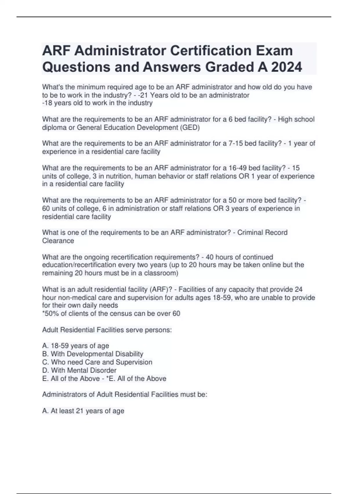 What's the minimum required age to be an ARF administrator and how old do you have to be to work in the industry? - -21 Years old to be an administrator -18 years old to work in the industry What are the requirements to be an ARF administrator for a 6 bed facility? - High school diploma or General Education Development (GED) What are the requirements to be an ARF administrator for a 7-15 bed facility? - 1 year of experience in a residential care facility What are the requirements to be an ARF administrator for a 16-49 bed facility? - 15 units of college, 3 in nutrition, human behavior or staff relations OR 1 year of experience in a residential care facility What are the requirements to be an ARF administrator for a 50 or more bed facility? - 60 units of college, 6 in administration or staff relations OR 3 years of experience in residential care facility What is one of the requirements to be an ARF administrator? - Criminal Record Clearance What are the ongoing recertification requirements? - 40 hours of continued education/recertification every two years (up to 20 hours may be taken online but the remaining 20 hours must be in a classroom) What is an adult residential facility (ARF)? - Facilities of any capacity that provide 24 hour non-medical care and supervision for adults ages 18-59, who are unable to provide for their own daily needs *50% of clients of the census can be over 60 Adult Residential Facilities serve persons: A. 18-59 years of age B. With Developmental Disability C. Who need Care and Supervision D. With Mental Disorder E. All of the Above - *E. All of the Above Administrators of Adult Residential Facilities must be: A. At least 21 years of age B. Certified C. College Graduate D. At least 18 years of age E. Both A & B - E. Both A & B Prior to admitting a person with a Mental Disorder the facility must obtain: A. Approval from Community Care Licensing B. Mental Health Assessment C. Physician's Order D. All of the above - *D. All of the Above What do the Activities of Daily Life (ADL's) include? - (Bad Dudes Talk Trash Everyday Constantly) Bathing Dressing Toileting Transferring Eating Continence What is an Administrator? - A licensee, or the adult designated by the licensee to act in his/her behalf in the overall management of the facility (*adult means a person who is 18 years of age or older, duh.) What does Basic Rate mean? - The rate charged by a facility to provide basic services What are Basic Services? - The services required (by applicable law and regulation) to be provided by the licensee in order to obtain and maintain a community care facility license What is California Clearance mean? - When an individual has no felony or misdemeanor convictions reported by the California Department of Justice (however, the individual may have been arrested with no criminal conviction, convicted of a minor traffic offense or adjudicated as a juvenile) What does Capacity mean? - It is the maximum number of persons (clients) authorized to be provided care and supervision at any one time in any licensed facility What does Residency mean? - It is the number of clients + staff in a licensed facility (live-ins or staying overnight) *Anyone that resides in the home 18+ or older needs to be live scanned What does Control of Property mean? - The right to enter, occupy, and maintain the operation of the facility property with regulatory requirements.