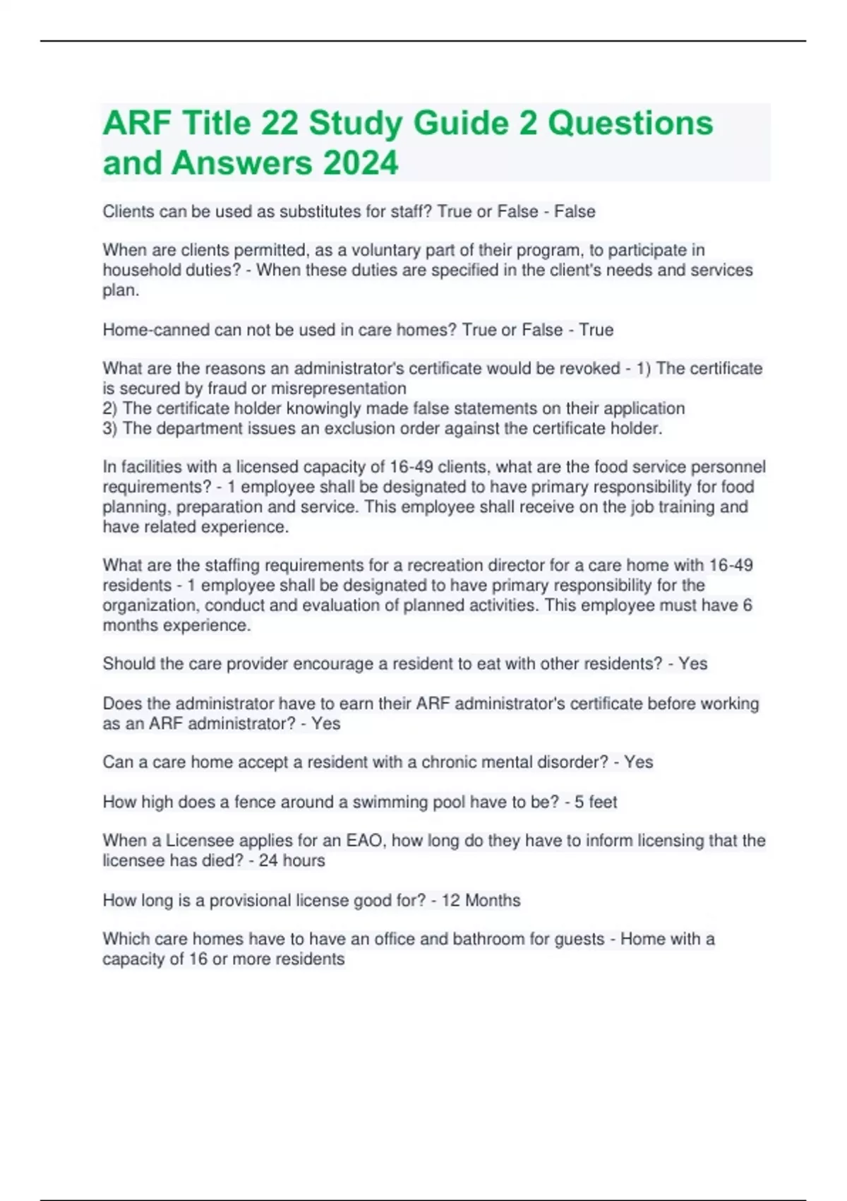 ARF Title 22 Study Guide 2 Questions and Answers 2024