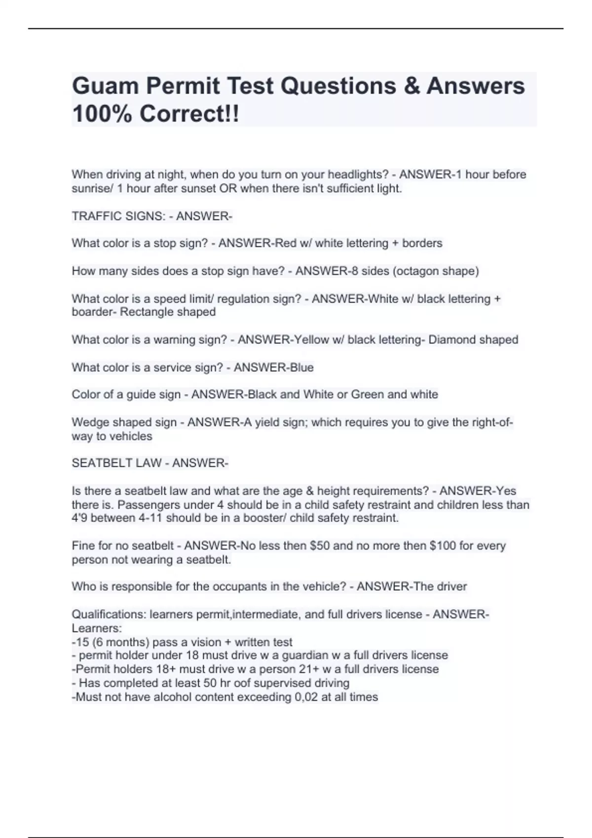 Guam Permit Test Questions & Answers 100% Correct!!