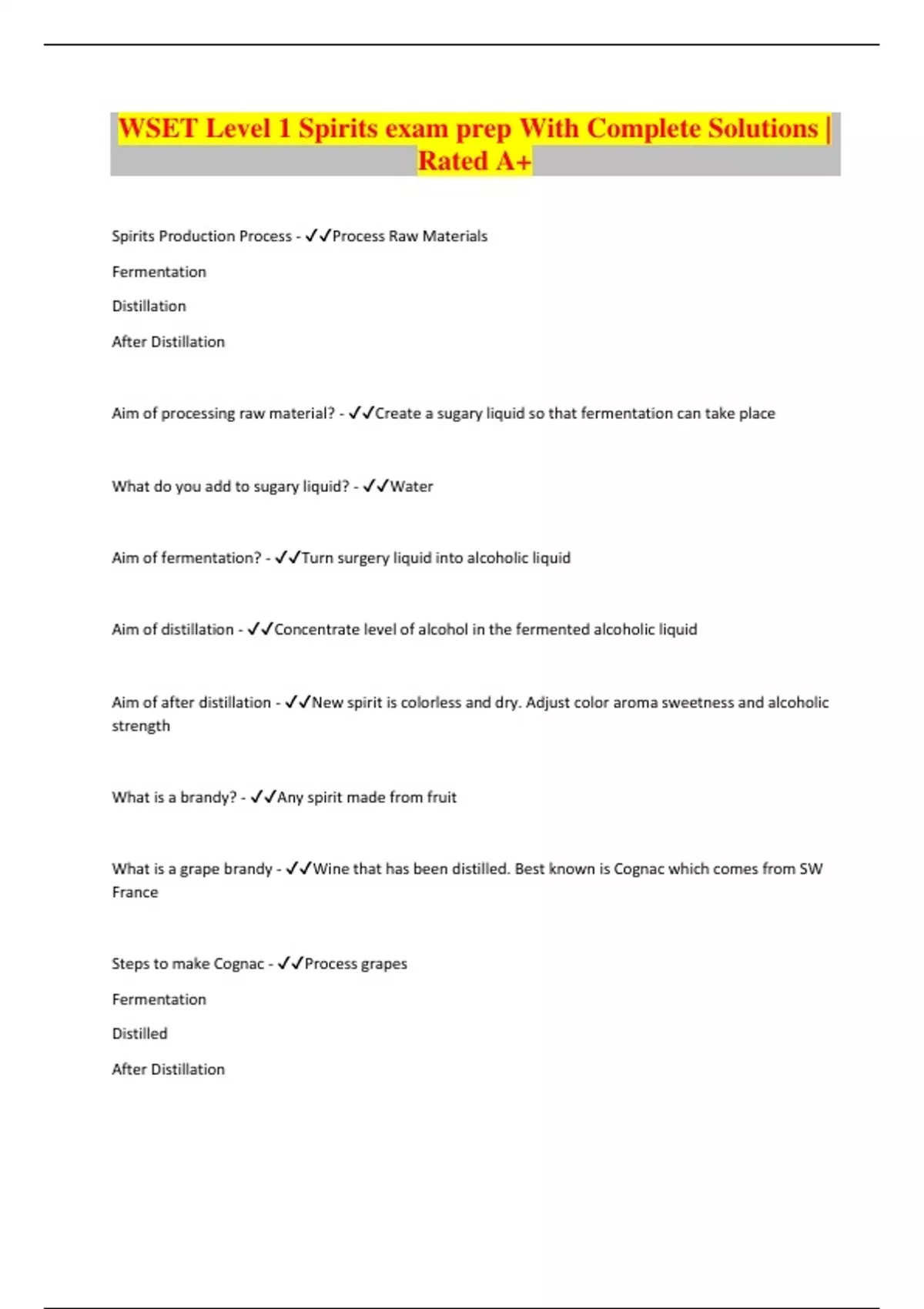 WSET Level 1 Spirits exam prep With Complete Solutions | Rated A+ Spirits Production Process - Process Raw Materials Fermentation Distillation After Distillation Aim of processing raw material? - Create a sugary liquid so that fermentation can take place What do you add to sugary liquid? - Water Aim of fermentation? - Turn surgery liquid into alcoholic liquid Aim of distillation - Concentrate level of alcohol in the fermented alcoholic liquid Aim of after distillation - New spirit is colorless and dry. Adjust color aroma sweetness and alcoholic strength What is a brandy? - Any spirit made from fruit What is a grape brandy - Wine that has been distilled. Best known is Cognac which comes from SW France Steps to make Cognac - Process grapes Fermentation Distilled After Distillation Cognac must be distilled how? - Double distilled in a pot still Pot stills produce what kind of spirits? - Low strength, a lot of flavor and character
