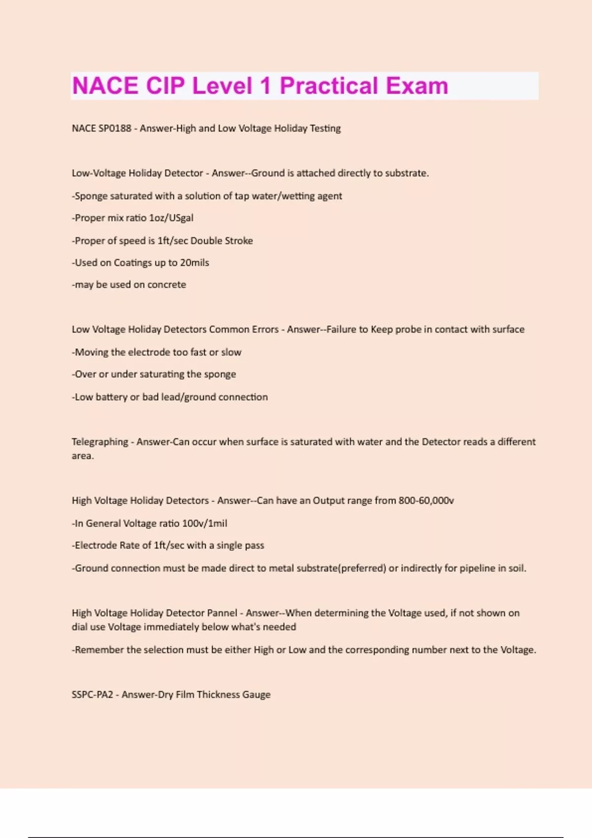 NACE SP0188 - Answer-High and Low Voltage Holiday Testing Low-Voltage Holiday Detector - Answer--Ground is attached directly to substrate. -Sponge saturated with a solution of tap water/wetting agent -Proper mix ratio 1oz/USgal -Proper of speed is 1ft/sec Double Stroke -Used on Coatings up to 20mils -may be used on concrete Low Voltage Holiday Detectors Common Errors - Answer--Failure to Keep probe in contact with surface -Moving the electrode too fast or slow -Over or under saturating the sponge -Low battery or bad lead/ground connection Telegraphing - Answer-Can occur when surface is saturated with water and the Detector reads a different area. High Voltage Holiday Detectors - Answer--Can have an Output range from 800-60,000v -In General Voltage ratio 100v/1mil -Electrode Rate of 1ft/sec with a single pass -Ground connection must be made direct to metal substrate(preferred) or indirectly for pipeline in soil. High Voltage Holiday Detector Pannel - Answer--When determining the Voltage used, if not shown on dial use Voltage immediately below what's needed -Remember the selection must be either High or Low and the corresponding number next to the Voltage. SSPC-PA2 - Answer-Dry Film Thickness GaugeSSPC-PA2 Type 1 - Answer-Magnetic Pull-Off DFT Gauge -Dial-Type Magnetic Pull-Off DFT Gauge (Banana Gauge) -Pencil Type Magnetic Pull-Off DFT Gauge Dial TypeMagnetic Pull-Off DFT Gauge - Answer--Known as "Banana Gauge" -Intrinsically Safe -Some Models Can Be Used Underwater ASTM D 7091 - Answer--Calibration: Gauge Shall be Calibrated by manufacturer or third party lab. -BMR: In order to compensate for any effects from the blast profile must calculate the Base Metal Reading. -Verify Accuracy: Use certified metal plates and Gauge must be within 5% of expected range. Type 1 DFT Gauge Adjustment - Answer--Take 10 reading on the blasted steel surface and average the results. -Take DFT measurements - Subtract BMR from DFT Averages Type 1 DFT Gauge Potential Errors - Answer-DO NOT Use Gauge: -On soft or tacky films -On or near vibrating surfaces - Within 1 inch of an edge -On metal being welded (can demagnetize unit) -Keep magnet tip clean of magnetic particles and residue -On Circular Pieces locate the Gauge along the longitudinal axis Edge Effect - Answer-Defined by ASTM B244 as being sensitive to abrupt changes in the surface contour of the test specimen.Standards for DFT Measurement Frequency - Answer--SSPC PA-2* -IMO PSPC -ASTM D 7091 -ISO 2808, 2178, 19840 Potassium Ferricyanide Qualitative Test for Soluble Salts - Answer-Designed to detect the presence of salt on the substrate. Not designed to measure the quantity of these ions. Potassium Ferricyanide Test Procedure - Answer--Use Test Paper that comes with the Potassium Ferricyanide -Misting the surface with distilled water -Wipe Test paper to misted surface -A dark blue color will indicate the presence of soluble salts.