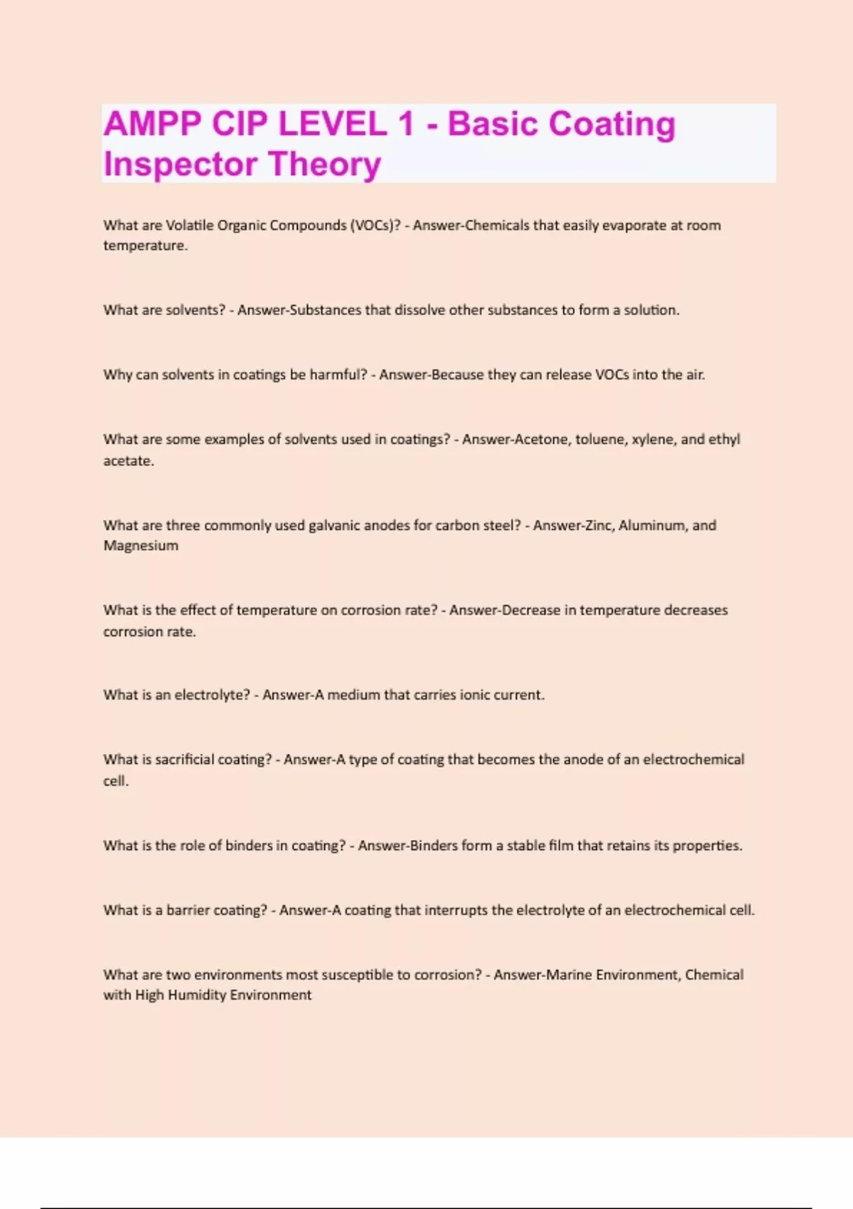 What are Volatile Organic Compounds (VOCs)? - Answer-Chemicals that easily evaporate at room temperature. What are solvents? - Answer-Substances that dissolve other substances to form a solution. Why can solvents in coatings be harmful? - Answer-Because they can release VOCs into the air. What are some examples of solvents used in coatings? - Answer-Acetone, toluene, xylene, and ethyl acetate. What are three commonly used galvanic anodes for carbon steel? - Answer-Zinc, Aluminum, and Magnesium What is the effect of temperature on corrosion rate? - Answer-Decrease in temperature decreases corrosion rate. What is an electrolyte? - Answer-A medium that carries ionic current. What is sacrificial coating? - Answer-A type of coating that becomes the anode of an electrochemical cell. What is the role of binders in coating? - Answer-Binders form a stable film that retains its properties. What is a barrier coating? - Answer-A coating that interrupts the electrolyte of an electrochemical cell. What are two environments most susceptible to corrosion? - Answer-Marine Environment, Chemical with High Humidity EnvironmentWhat is the direction of electron flow in an oxidation reaction? - Answer-From the anode to the cathode through the metallic path. What is the role of binders? - Answer-Binders bonds pigments together and adhere to surface. What are solvents? - Answer-Solvents are liquids that dissolve the solid resins. What is the purpose of pigments? - Answer-Pigments hide the substrates, provide decorative color, and enhance desired properties. What are additives? - Answer-Additives are special purpose ingredients used to enhance the performance. What are vehicles? - Answer-Vehicles are the liquid portions of the coating. What is corrosion? - Answer-Deterioration of metal or alloy due to electrochemical reaction. What is passivation? - Answer-Layer of oxides on metal surface for corrosion protection. Give an example of a metal that undergoes passivation. - Answer-Stainless steel What is an anode? - Answer-The electrode where oxidation occurs. What is a cathode? - Answer-The electrode where reduction occurs. What is a metallic pathway? - Answer-The conductive path for electrons to flow. What are electrolytes? - Answer-Substances that conduct electricity when dissolved in water.What is the function of an electrolyte in corrosion? - Answer-Allows passage of ions in corrosion cell. What is the function of a metallic pathway in corrosion? - Answer-Allows flow of electrons in corrosion cell. What is the galvanic series? - Answer-Listing of metals in order of reactivity. What is the general rule of the galvanic series? - Answer-Less noble metal connected to a more noble metal will corrode preferentially. What is localized corrosion? - Answer-Corrosion that occurs in specific areas. What are the types of localized corrosion? - Answer-Pitting and crevice corrosion. Why is localized corrosion concerning? - Answer-Damage is concentrated and can lead to structural failure. What is general corrosion? - Answer-Uniform loss of material over entire surface. How does general corrosion affect the surface? - Answer-Results in general thinning of affected surface. Is general corrosion easy to inspect? - Answer-Yes, it is relatively easy to inspect. Does general corrosion cause catastrophic failure? - Answer-No, it does not cause catastrophic failure. What is inorganic convertible thermosetting? - Answer-Coating that undergoes irreversible chemical changes upon curing. What is inorganic non-convertible thermoplastic? - Answer-Coating that softens upon heating and hardens upon cooling.What are the primary components of a liquid applied coating? - Answer-Pigments and Vehicle (Resin or Binder and Solvent) What is a sacrificial coating system? - Answer-A coating system where a more active metal is applied over a less active metal to act as an anode and protect the underlying metal