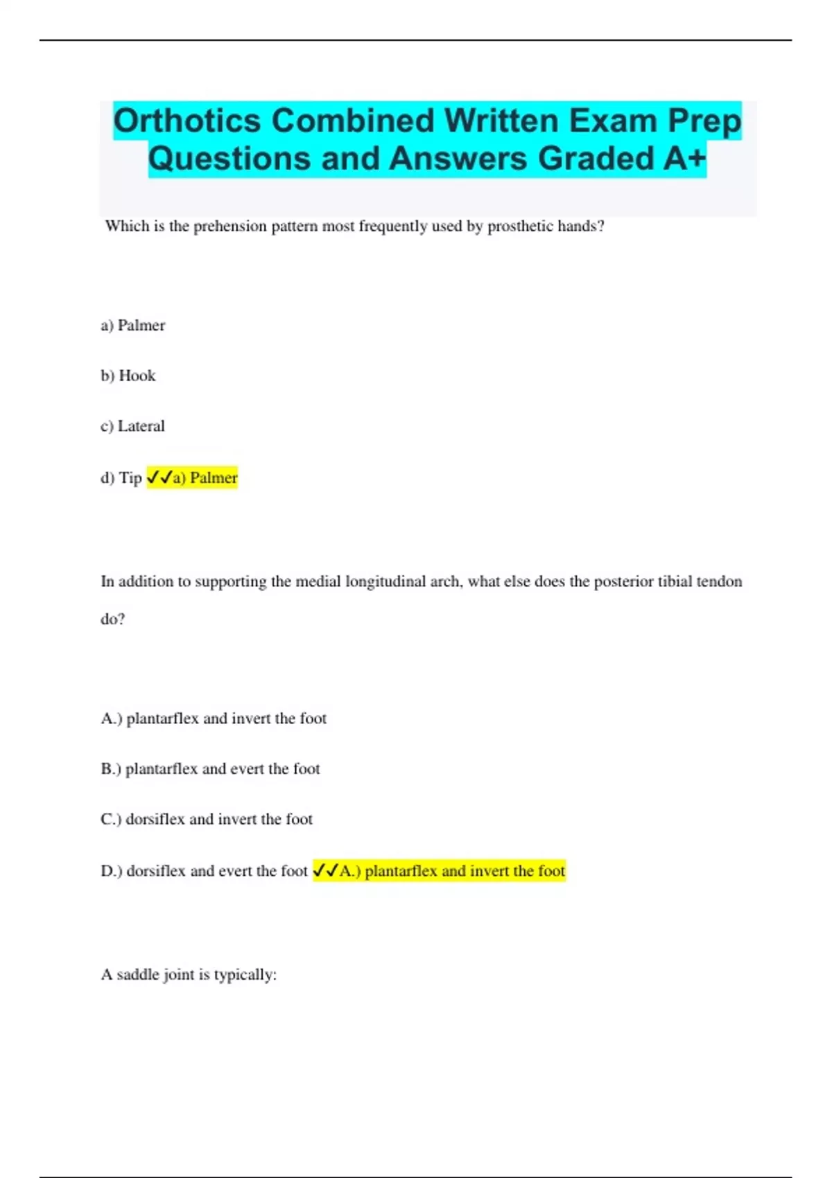 Orthotics Combined Written Exam Prep Questions and Answers Graded A+ Which is the prehension pattern most frequently used by prosthetic hands? a) Palmer b) Hook c) Lateral d) Tip a) Palmer In addition to supporting the medial longitudinal arch, what else does the posterior tibial tendon do? A.) plantarflex and invert the foot B.) plantarflex and evert the foot C.) dorsiflex and invert the foot D.) dorsiflex and evert the foot A.) plantarflex and invert the foot A saddle joint is typically: A.) uniaxial B.) biaxial C.) triaxial D.) it can be any of these B.) biaxial Which of the following is an example of a saddle joint? A.) the MP joints of the hand B.) the humoulnar joint of the elbow C.) the CMC joint of the thumb D.) the shoulder joint C.) the CMC joint of the thumb The large muscle located on the anterior aspect of the scapula is the: A.) supraspinatus B.) infrspinatus C.) subscapularis D.) teres major C.) subscapularis Which of the following will extend the back and trunk when contracted bilaterally? A.) Recuts Abdominus B.) Serratus Anterior C.) Latissimus Dorsi D.) Erector Spinae E.) Transverse Thoracis D.) Erector Spinae Which of the following can flex the elbow in any position? A.) Brachialis B.) Biceps Brachii C.) Brachioradialis D.) Triceps Brachii A.) Brachialis Point of contact between two neurons occurs at : A.) the neuromuscular junction B.) the cell body C.) the synapse D.) the point where the nerve emerges from the spinal cord C.) the synapse A collection of cell bodies within the CNS is typically called a: A.) nucleus B.) tract C.) gray matter D.) spinal nerve A.) nucleus The Sympathetic Division of the ANS is located: A.) in the anterior portion of the entire spinal cord B.) at the spinal levels of T1-T12 through L1-L3 C.) at the brainstem and cervical level D.) at the sacral level S2-4 B.) at the spinal levels of T1 - T12 and Through L1 - L3 T/F: The ventral (anterior) rami typically merge to form somatic plexus True The Fibrous connective tissue covering all bones (except at sites of articulation) A.) fibrocartilage B.) periosteum C.) perichondrium D.) anticardium B.) periosteum